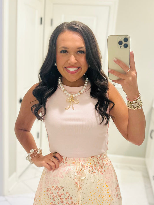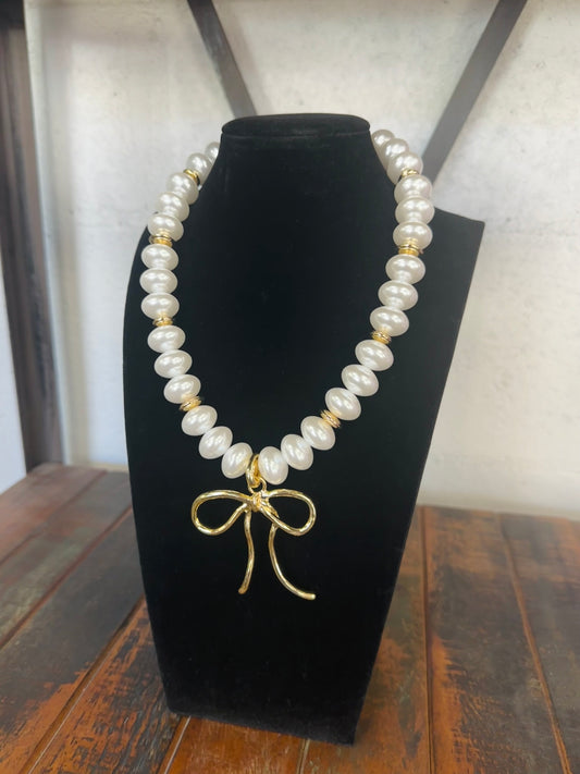 The Maggie Pearl + Gold Wide Bead Bow Pendant Necklace