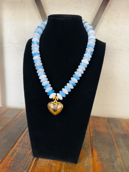 Blue + Gold Wide Bead Puffy Heart Necklace