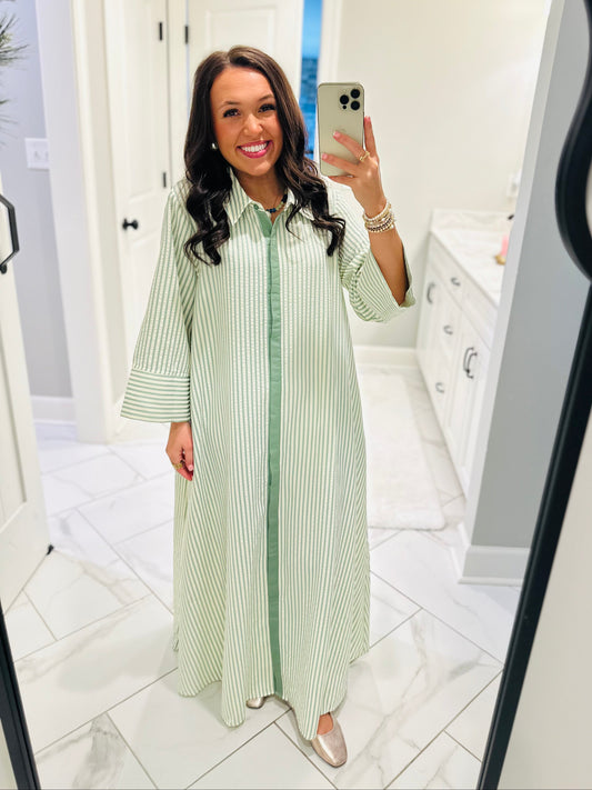 The Nora Sage Green Striped Midi Dress