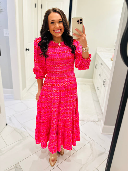 The Mira Ikat Ludlow Smocked Midi Dress