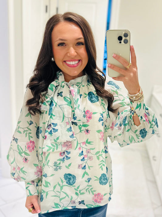 The Katherine Ivory Floral Bow Long Sleeve Top