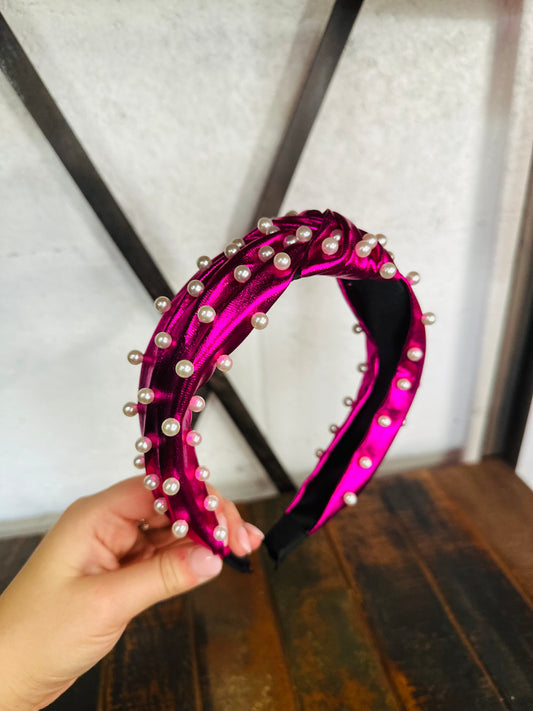 Fuchsia Metallic Pearl Embellished Top Knot Headband