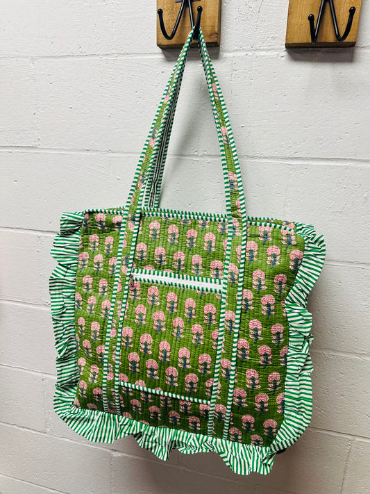 The Green Vintage Floral Ruffle Quilted Tote Bag