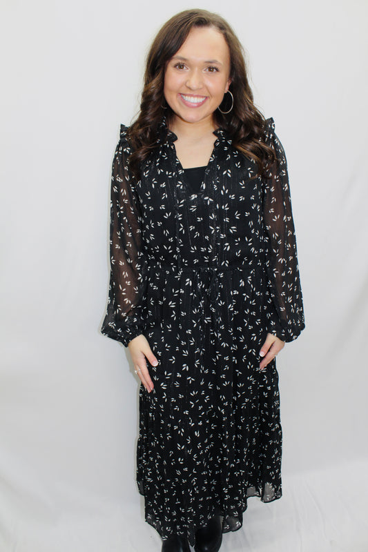 The Kace Black Floral Tiered Midi Dress