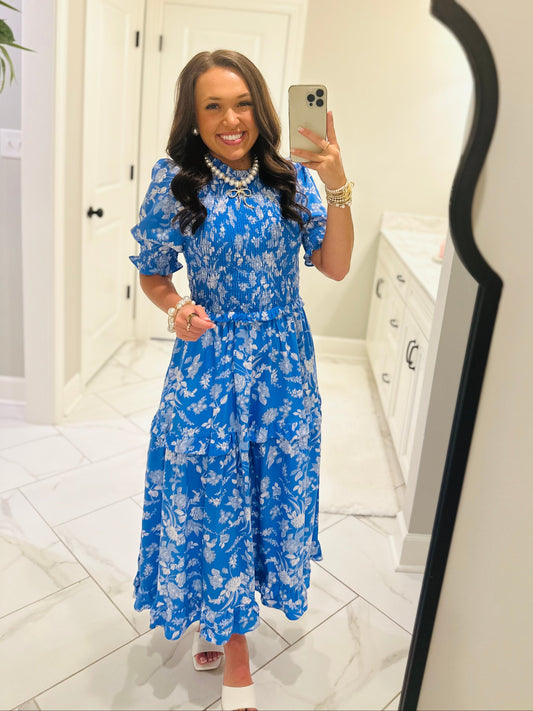 The Odella Blue Floral Smocked Midi Dress