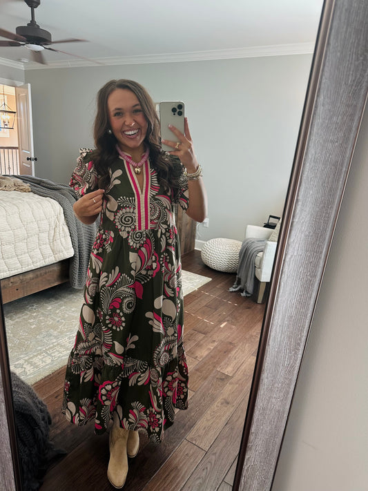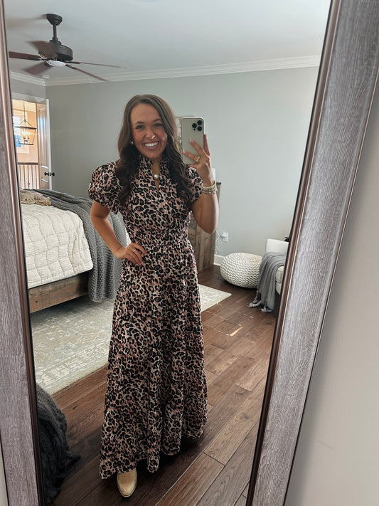 The Elizabeth Leopard Print Puff Sleeve Midi Dress