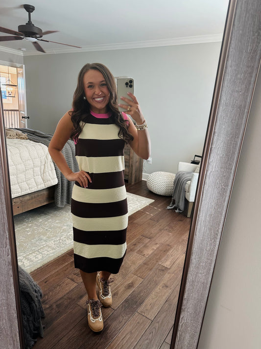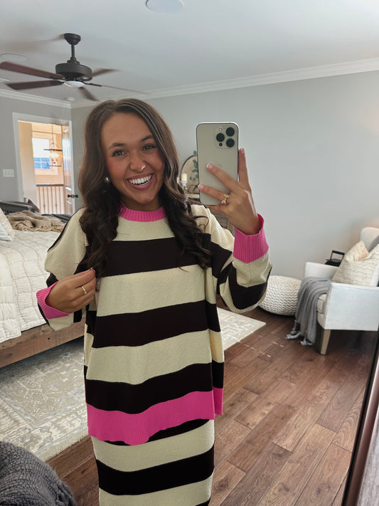 The Everlee Pink + Cream Striped Knit Midi Dress