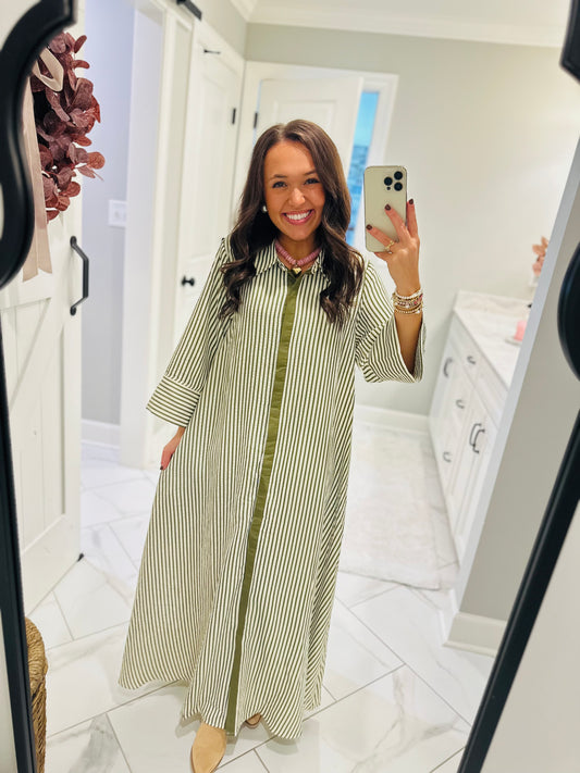The Nora Olive Green Striped Midi Dress