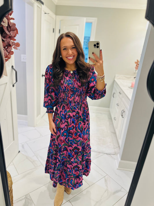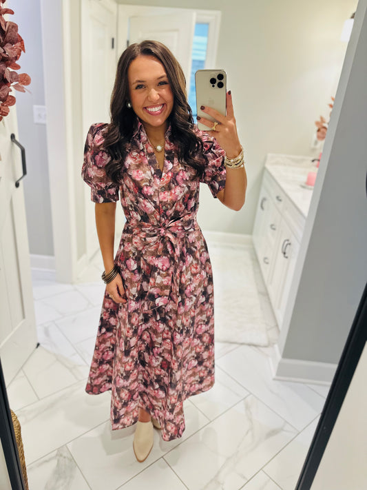 The Maggie Pink + Brown Floral Midi Dress