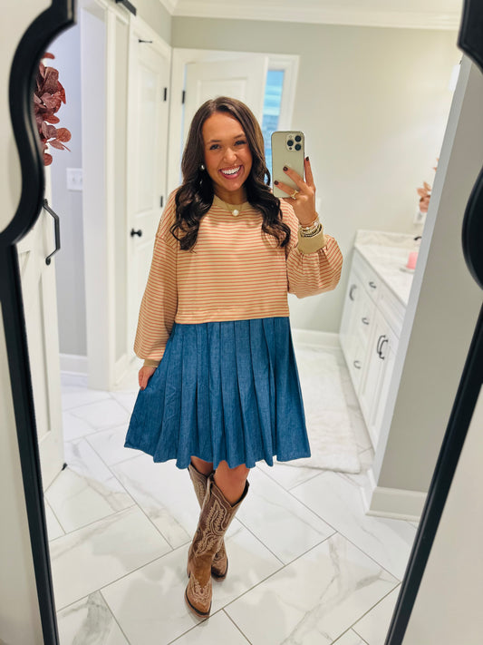 The Ella Long Sleeve Pleated Dress - Taupe / Denim
