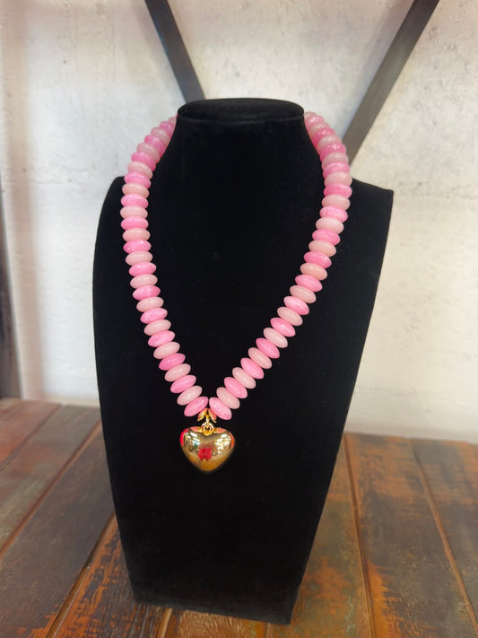 Pink + Gold Wide Bead Puffy Heart Necklace