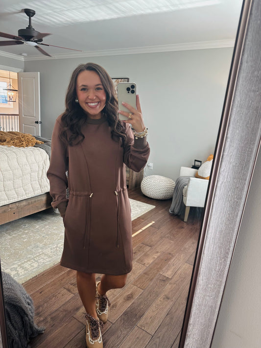 The Mocha Jersey Knit Long Sleeve Drawstring Dress