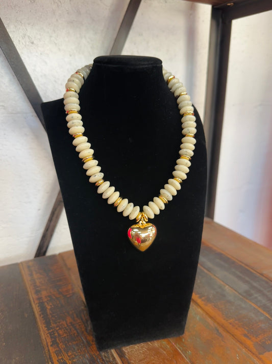 Beige + Gold Wide Bead Puffy Heart Necklace