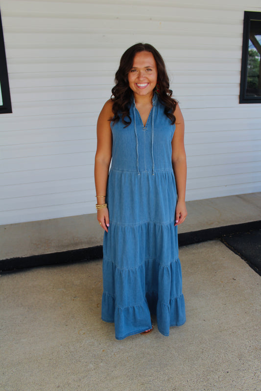 The Charity Light Wash Denim Maxi Dress