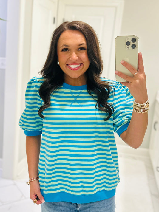 The Summer Blue + Lime Green Striped Puff Sleeve Top