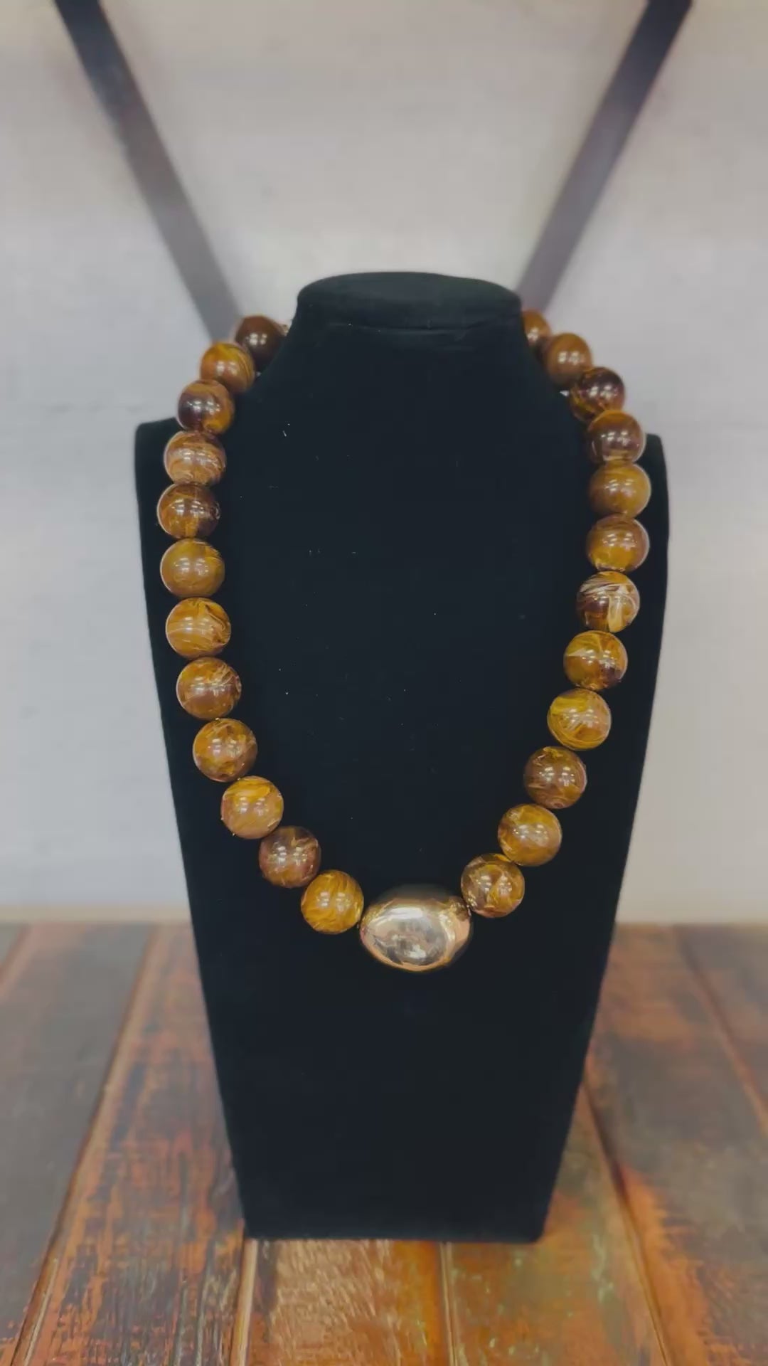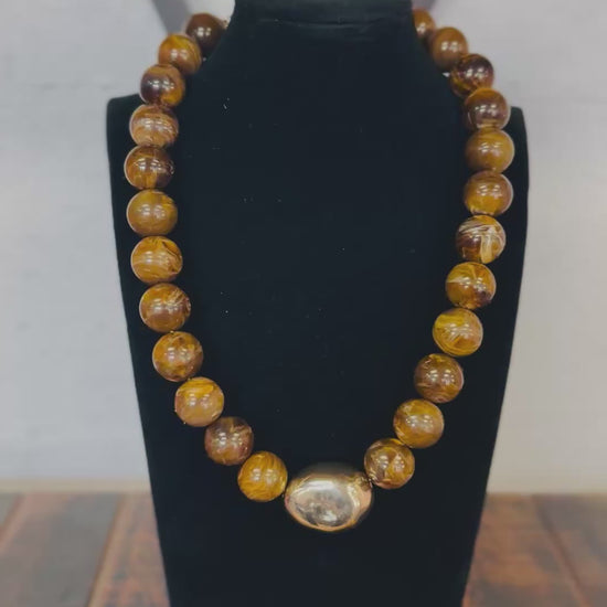 Brown Marble Beaded Necklace with Gold Statement Bead