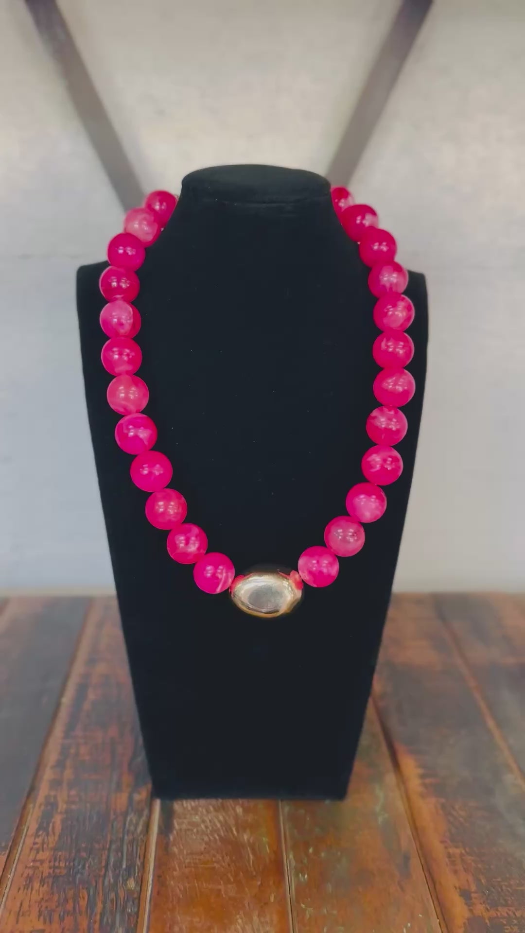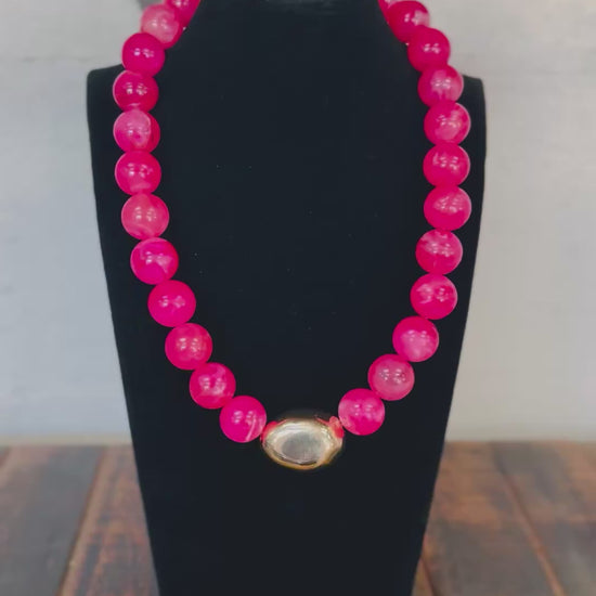 Fuchsia Marble Beaded Necklace with Gold Statement Bead