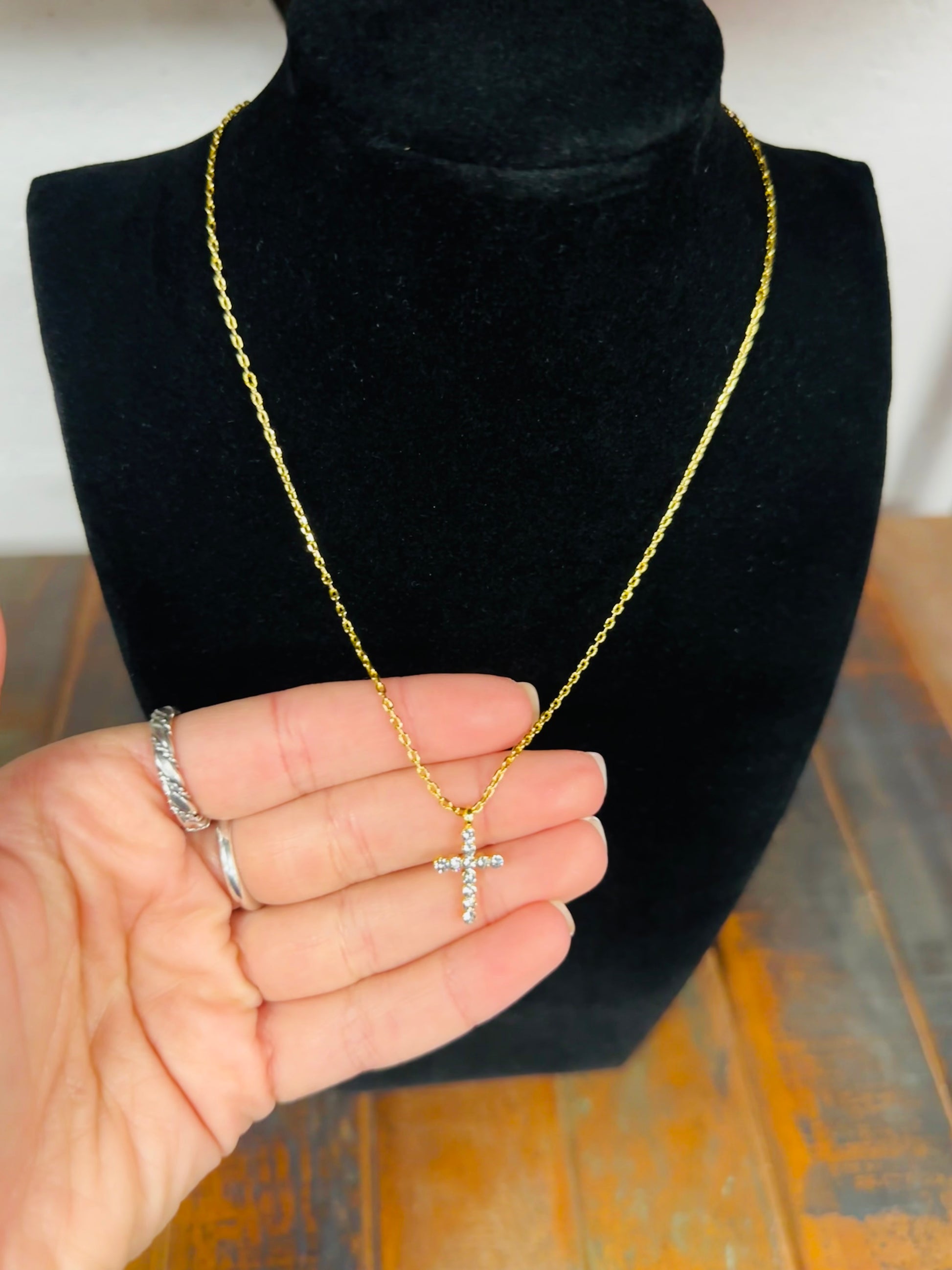 This new necklace features sparkling crystal accents and a modern cross design. It is the the perfect accessory for every outfit!