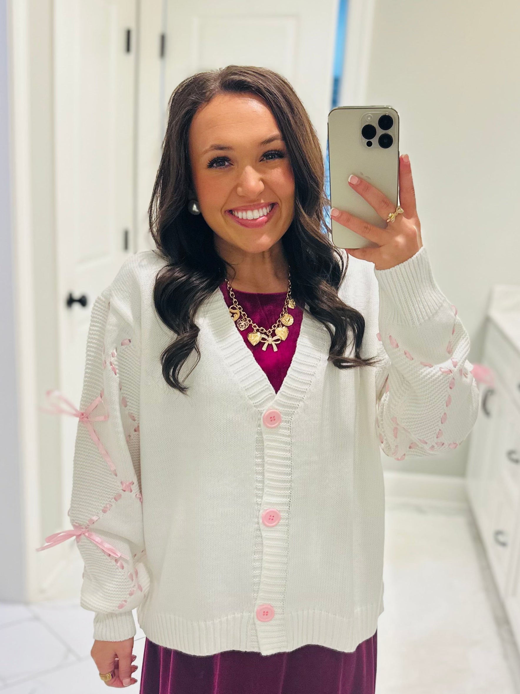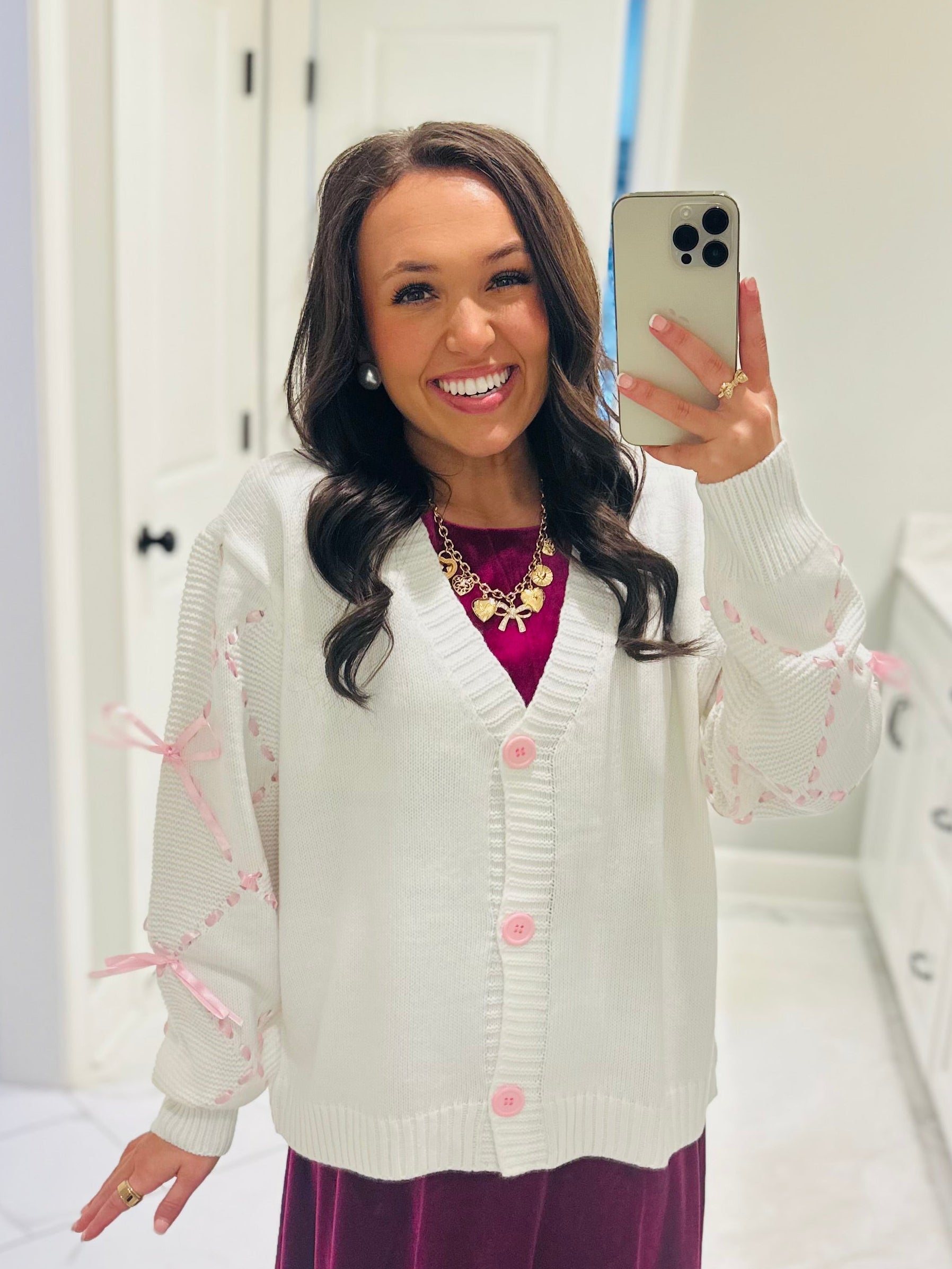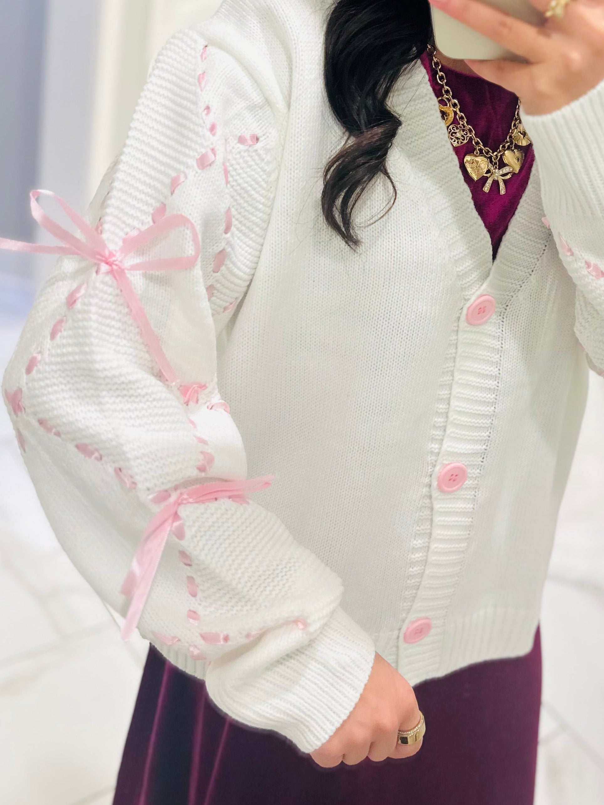 Sweetness with a side of sophistication. In love with this new pink cardi and its satin sleeve details 🎀 This cardigan is featured in a beautiful ivory color with pink satin sleeve detailing with ribbon bows. It's so sweet and stylish.Â