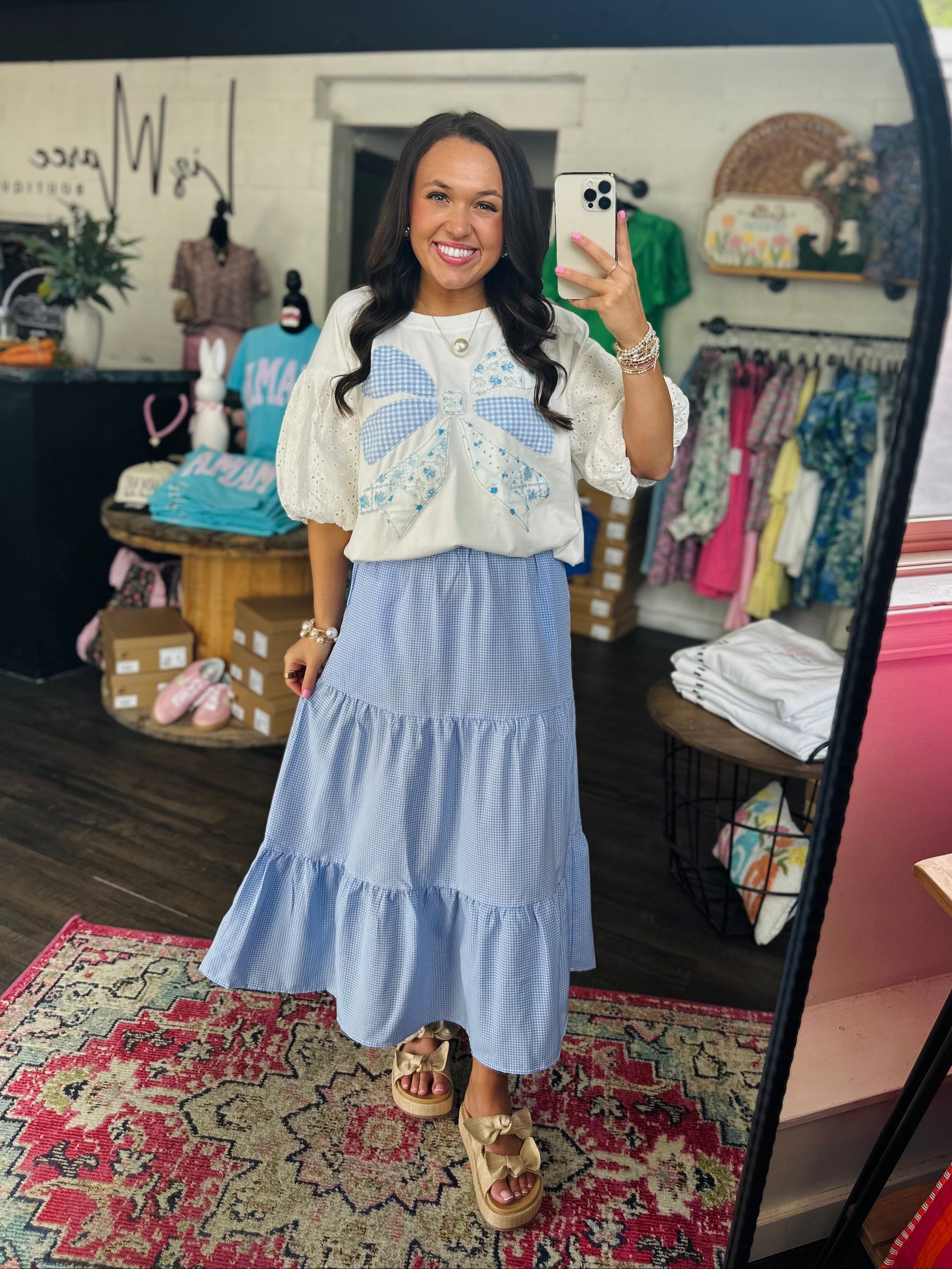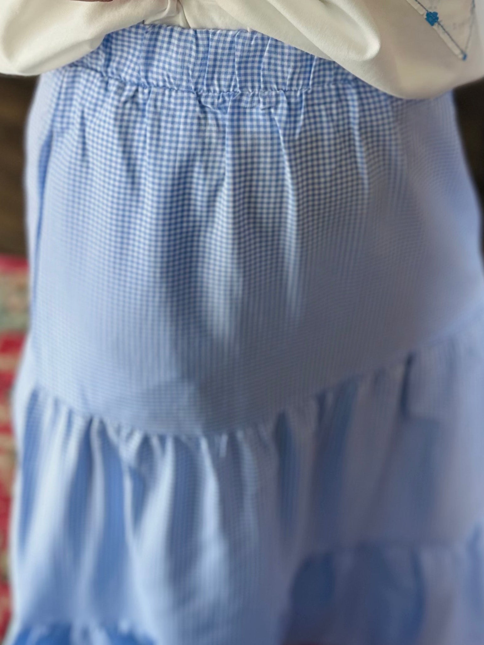 Simply obsessed with this blue gingham! 💙 This skirt features a beautiful baby blue gingham print that is maxi length, has an elastic waistband, and hidden side pockets. The skirt features a relaxed fit with multiple gathered tiers, adding volume and movement. The lightweight fabric and classic gingham pattern give it a casual yet feminine look. It's perfect for pairing with a top or graphic tee. Style with sneakers or sandals for a stylish and comfy look.