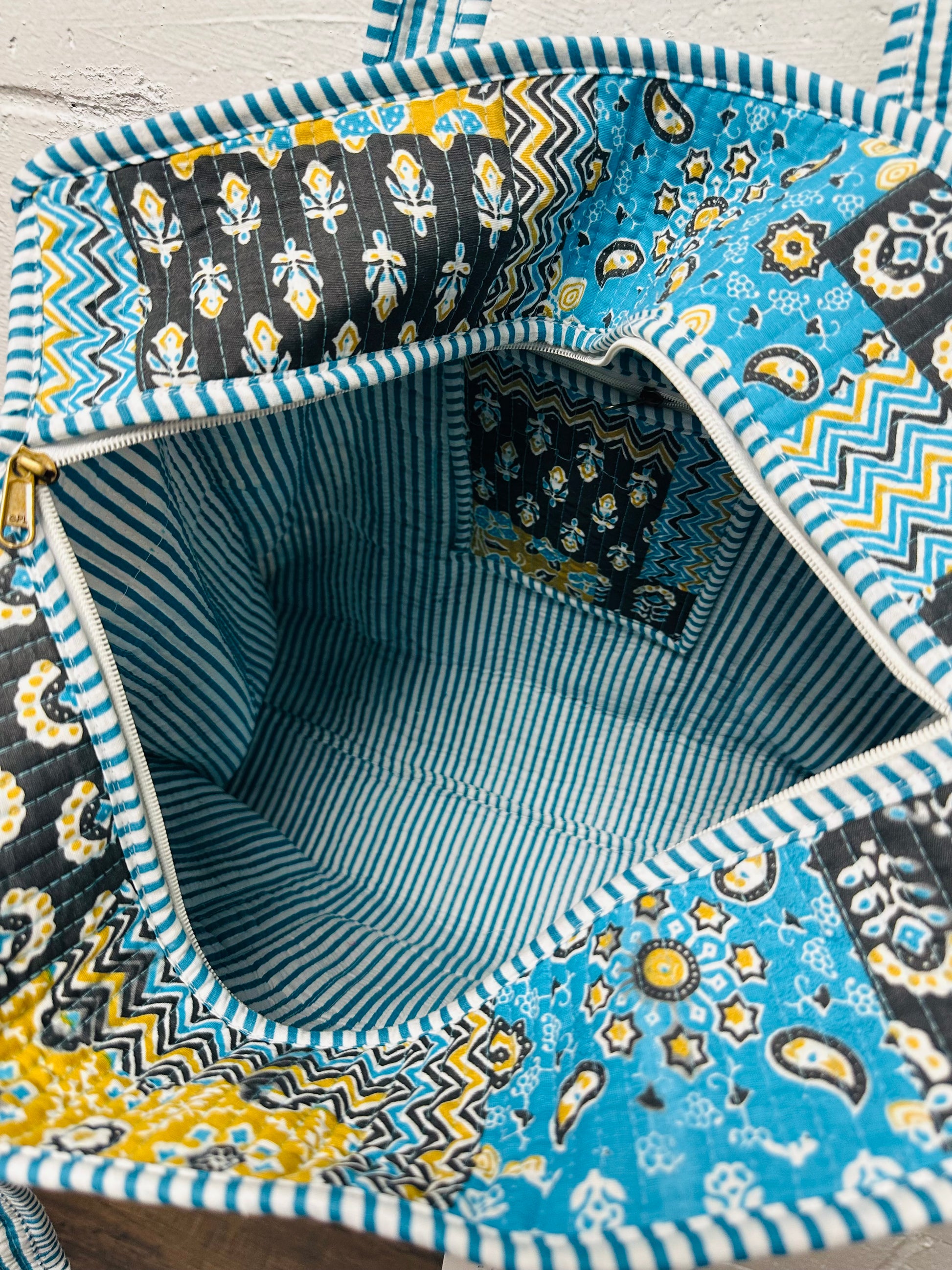 The Blue + Black Multi Pattern Quilted Tote Bag