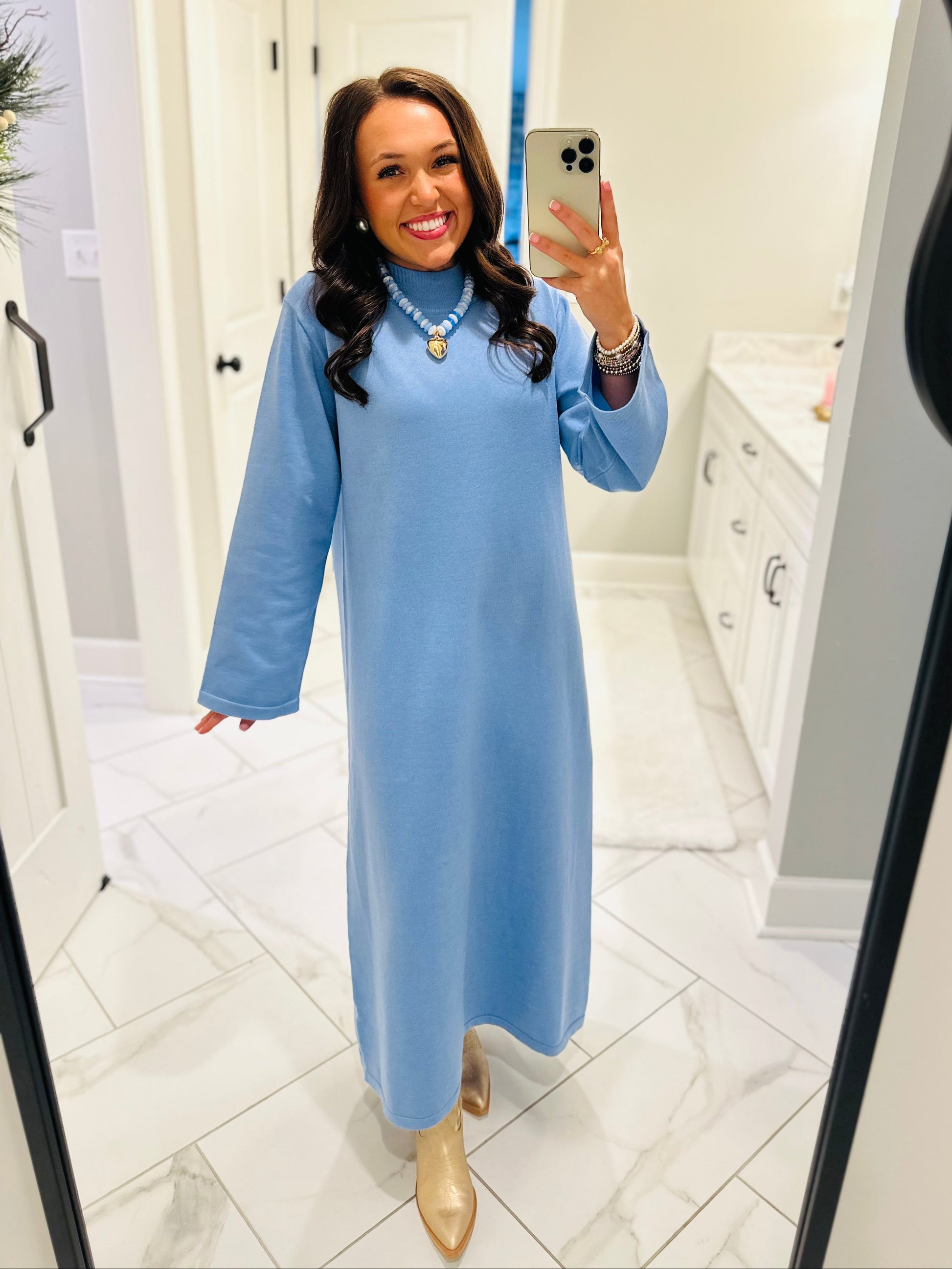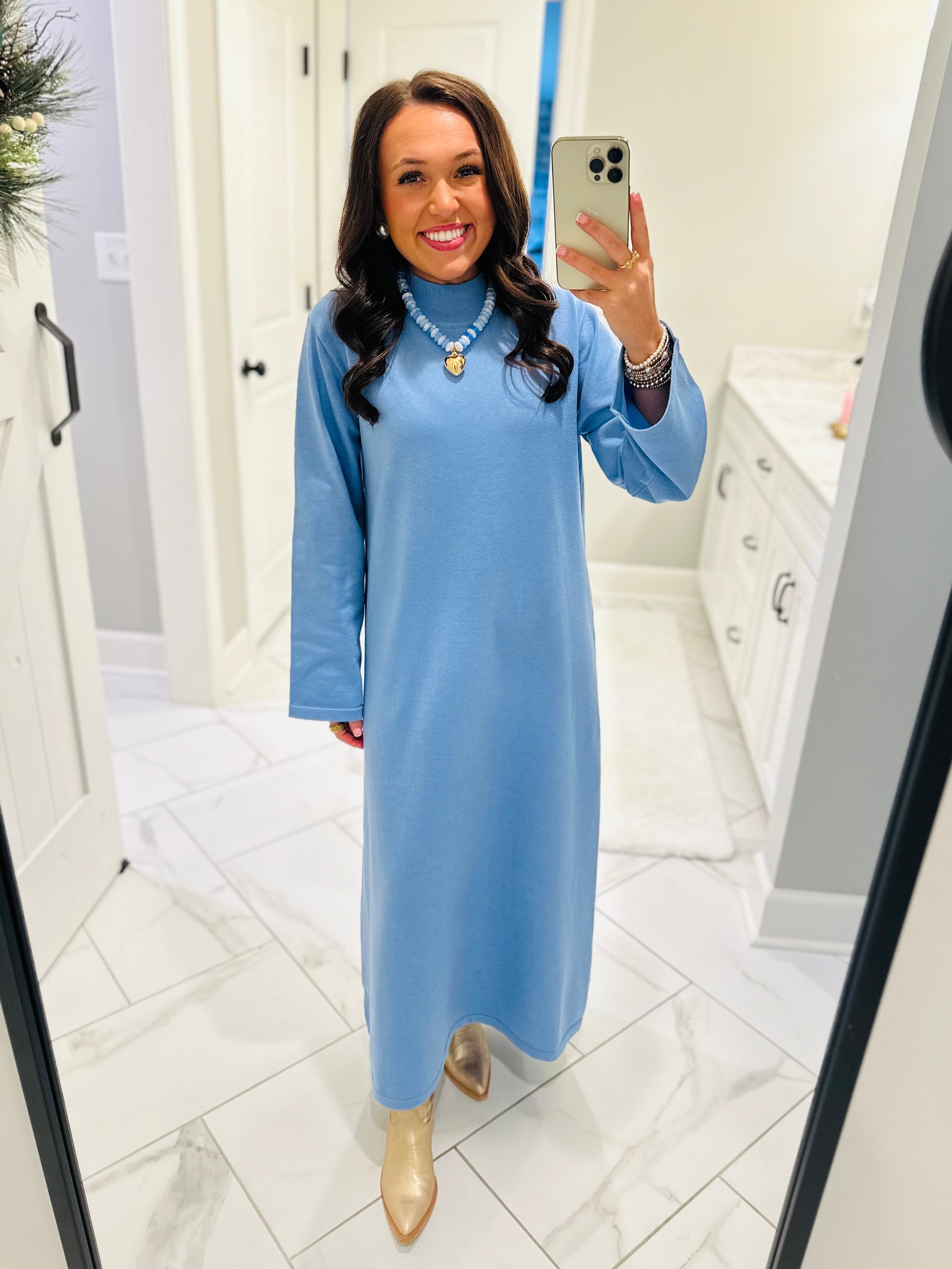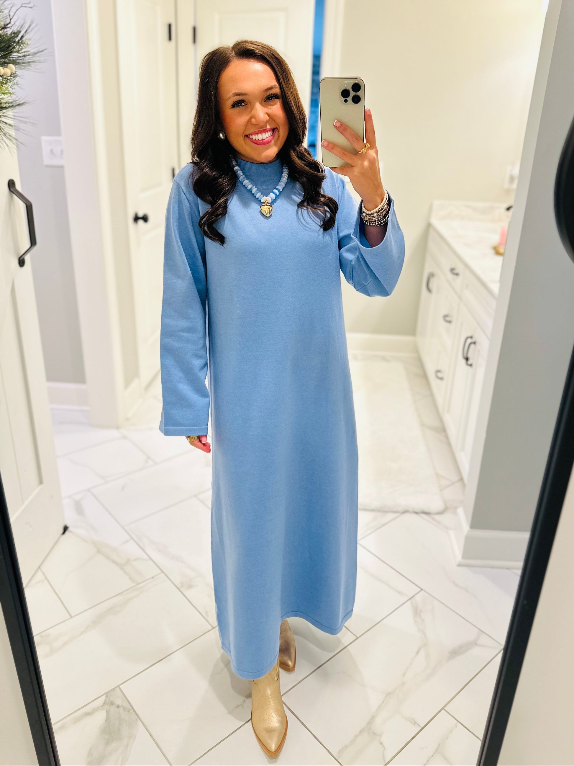 Soft, simple, and a staple is this new sweater dress! This dress features a beautiful solid blue color with a mock neckline, long sleeves, and is midi length. It is a medium weight knit making it not too thin and not too thick. It's perfect to wear by itself or layer a vest, scarf, or coat over. Dress it up or keep it casual - this dress is your go to! Style this dress with boots, sneakers, or mules. The options are endless!