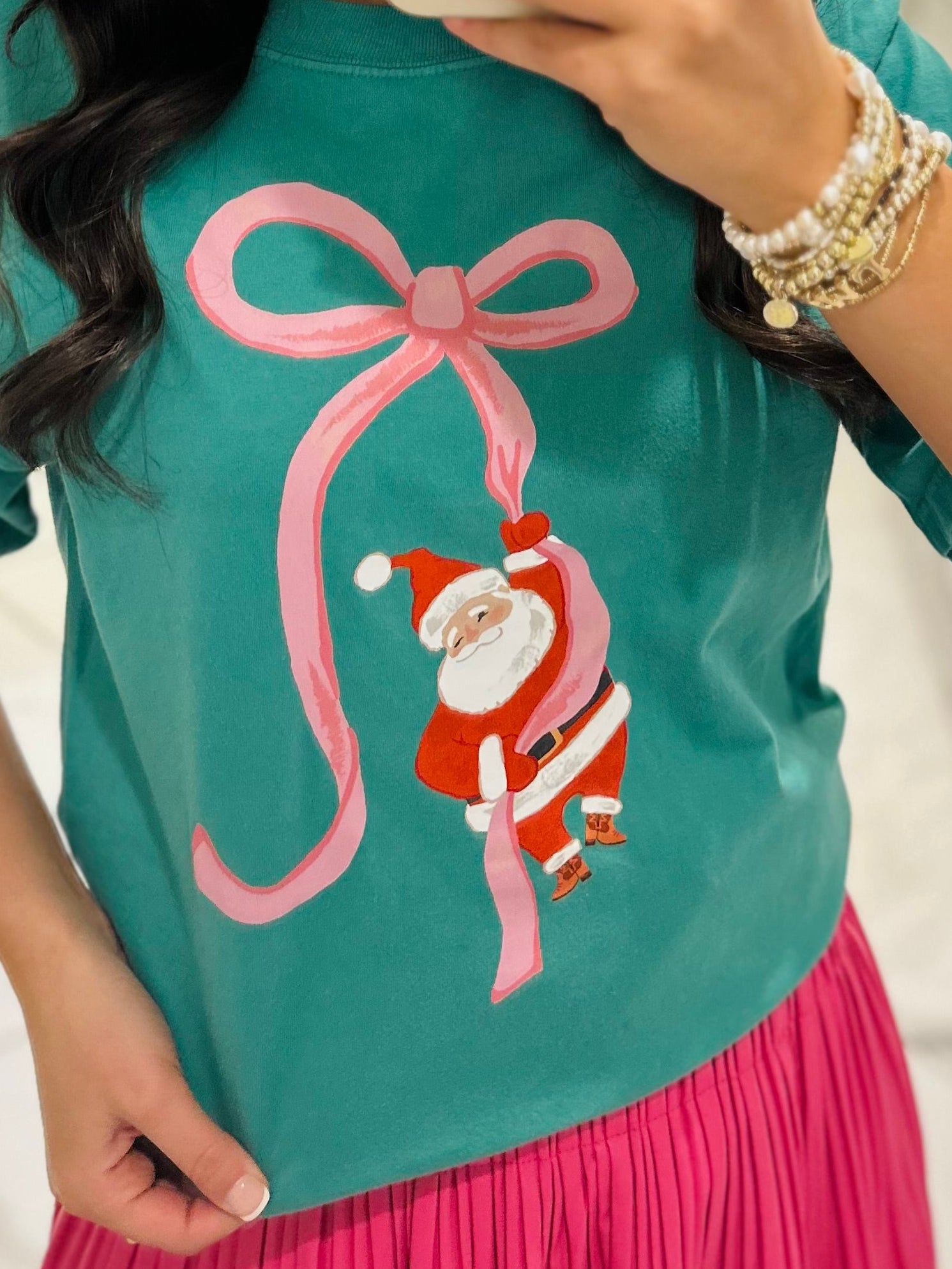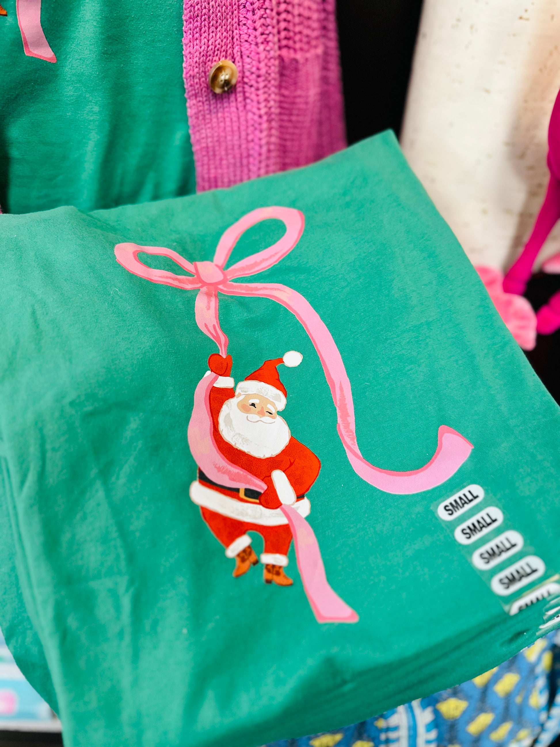 Santa-approved!!! This tee features a cute and country Santa hanging from a big pink ribbon bow. It's the perfect tee for every event this holiday season. Layer a cardigan over it or a turtleneck underneath it. There are so many ways to style this adorable tee!