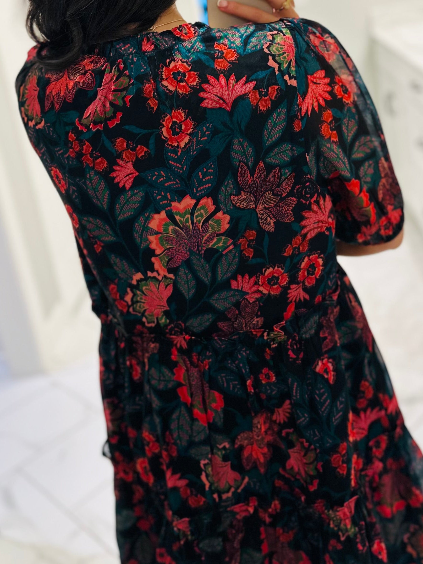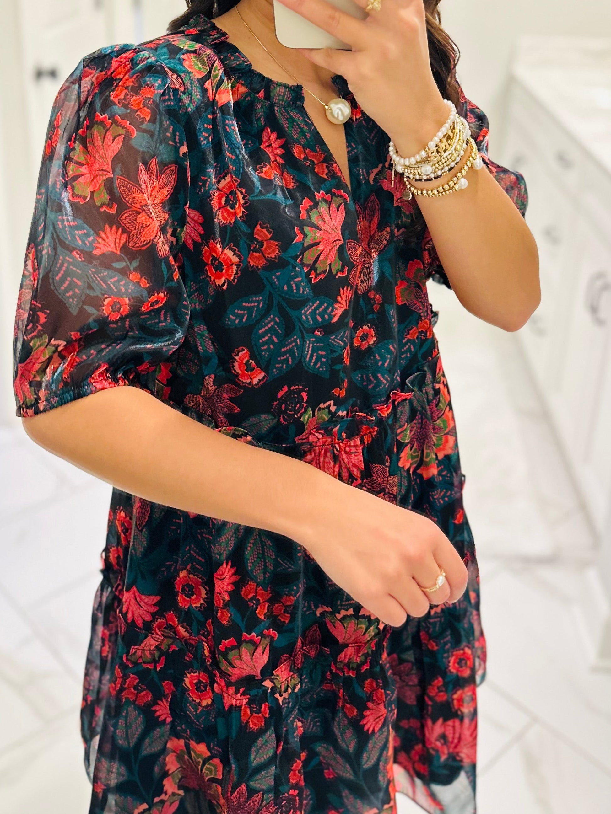 Make every moment unforgettable this holiday season in this fun and festive dress! This dress features short puff sleeves, a tiered skirt, and a flattering V-neckline. Style it with sleek heels and a chic clutch for a polished, sophisticated look. You can also style it with tall riding boots and a cardigan over it. It's perfect to wear all winter long!