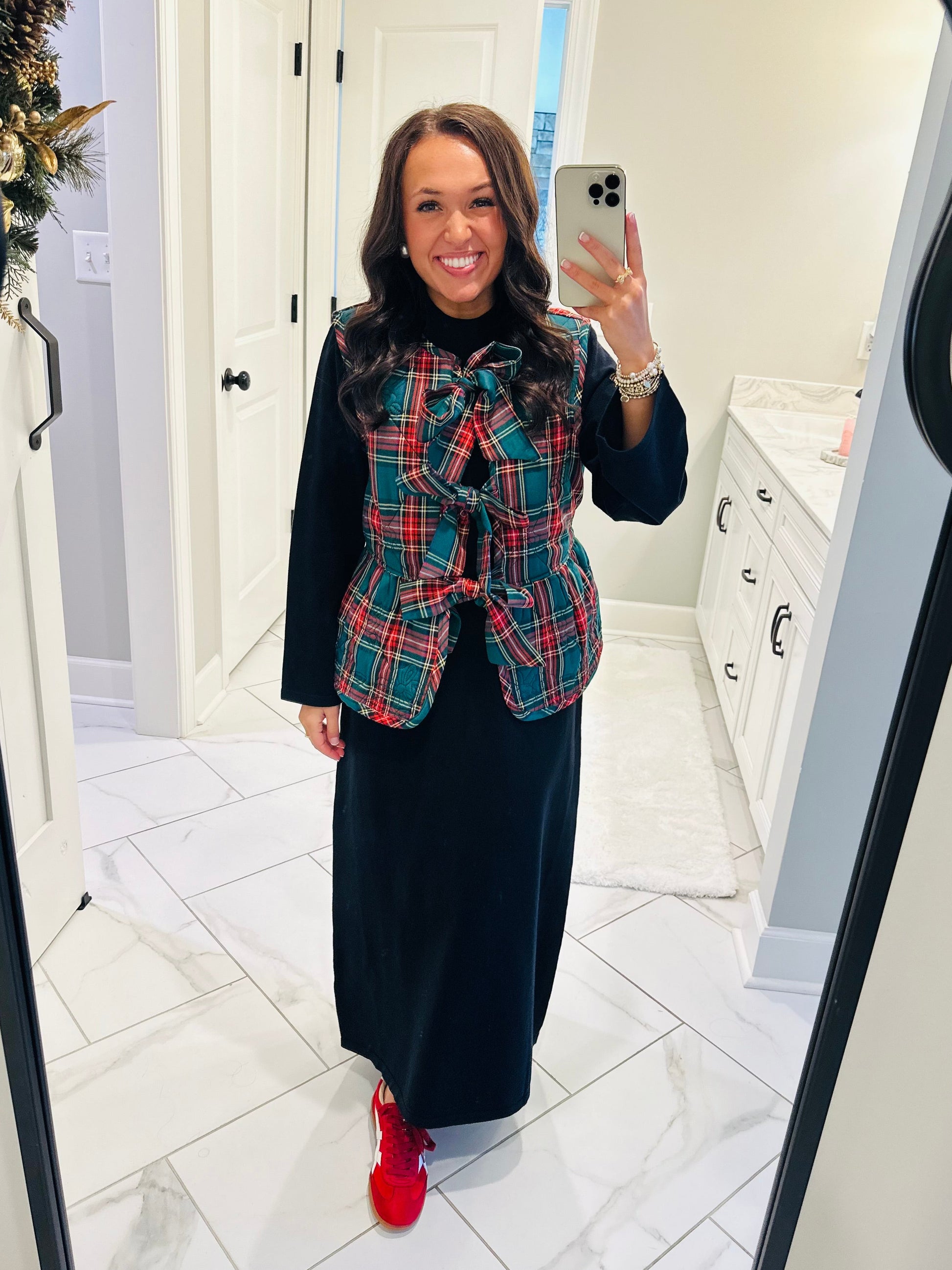 Making the holidays merry and plaid in this adorable vest! This new arrival features a beautiful green plaid print with self-tie bow closures at front. It is a quilted vest that is lined and is medium weight. It's perfect for every event and occasion. Style it with jeans or over a dress - the options are endless!
