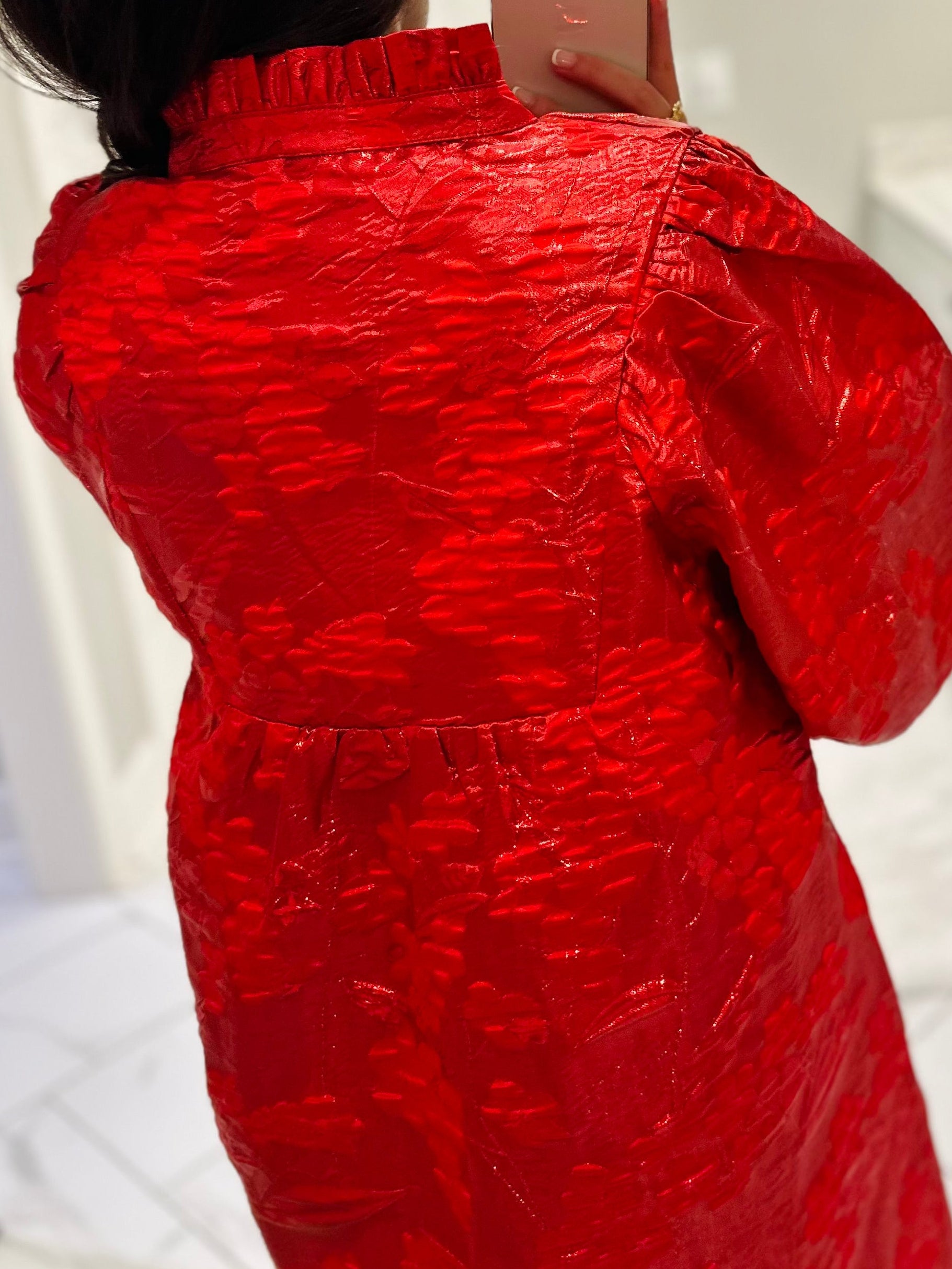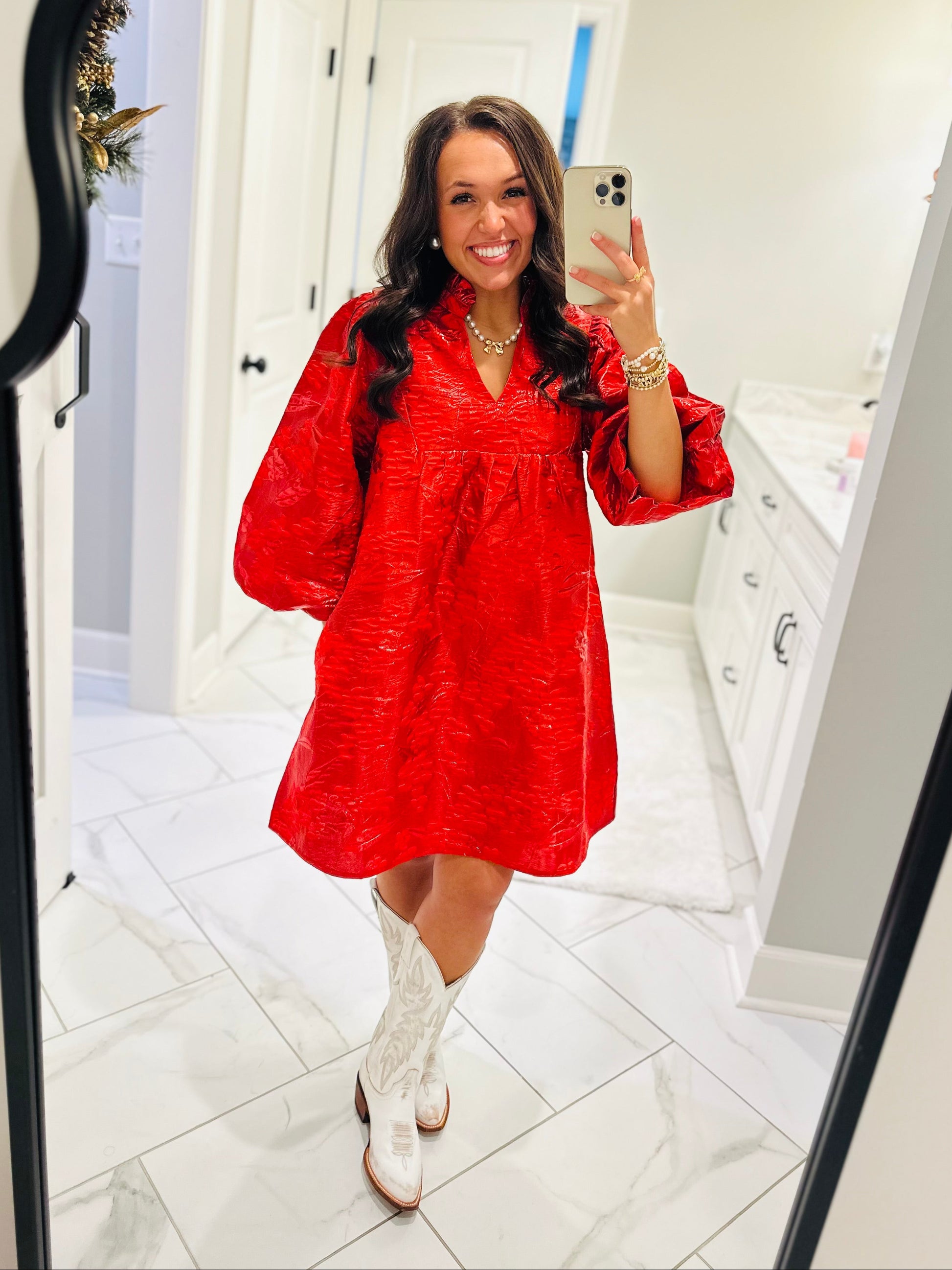 Red and ready for the holidays! This gorgeous new dress is perfect for every occasion this holiday season. This dress features a beautiful red jacquard shimmer print with fun puff balloon sleeves. This dress is lined and it even has pockets! Style with heels or boots, it's so darling!