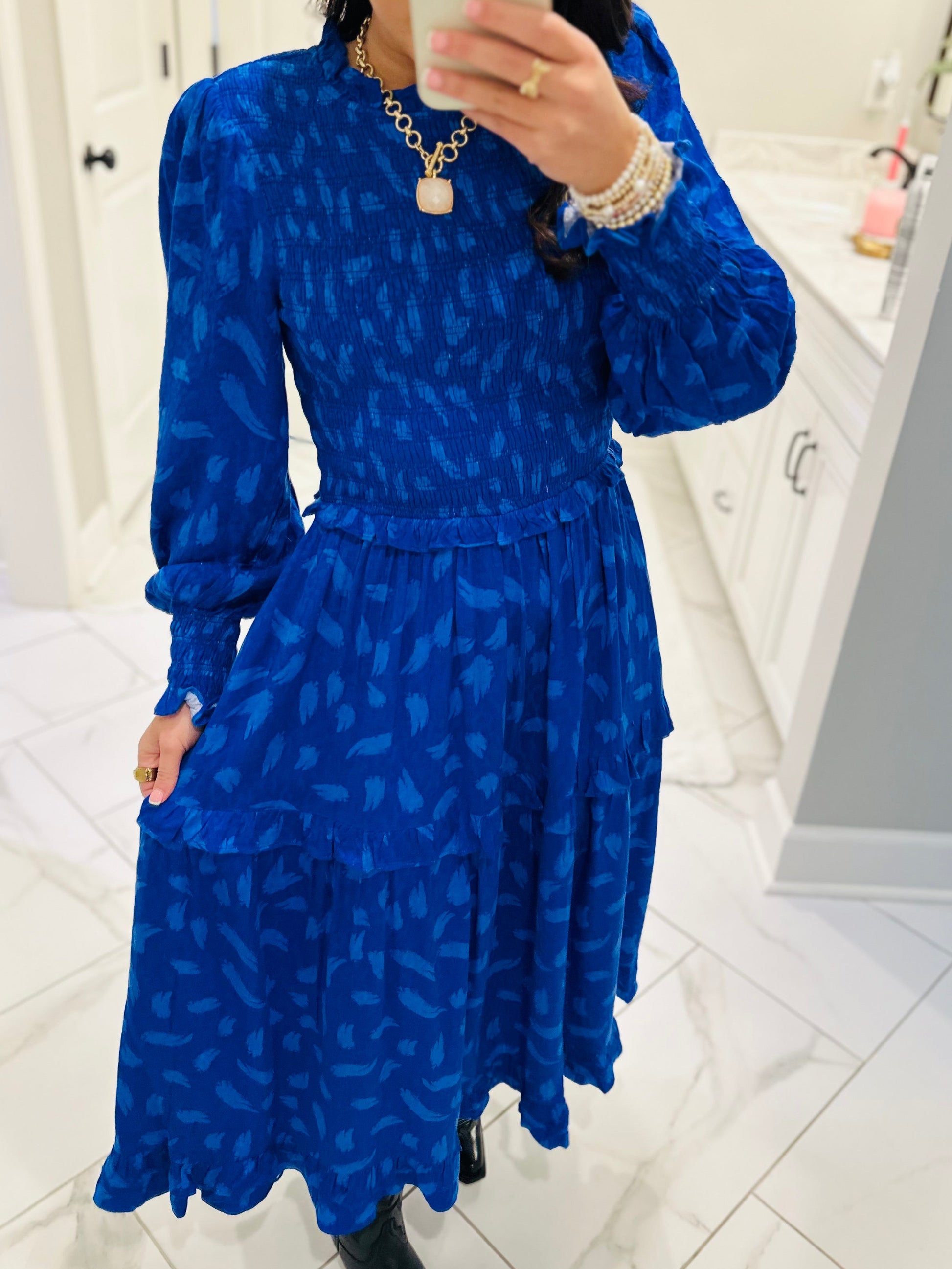 Feeling blue-tiful! This new arrival is cute, casual, and full of charm. This dress features a classy blue print, long sleeves with smocked cuffs, ruffle neck, and a full smocked top bodice. The dress has a tiered and ruffle silhouette that makes it flowy and light weight. This dress is perfect to wear with black, brown, or gold. The options are endless as it is the perfect year-round dress!