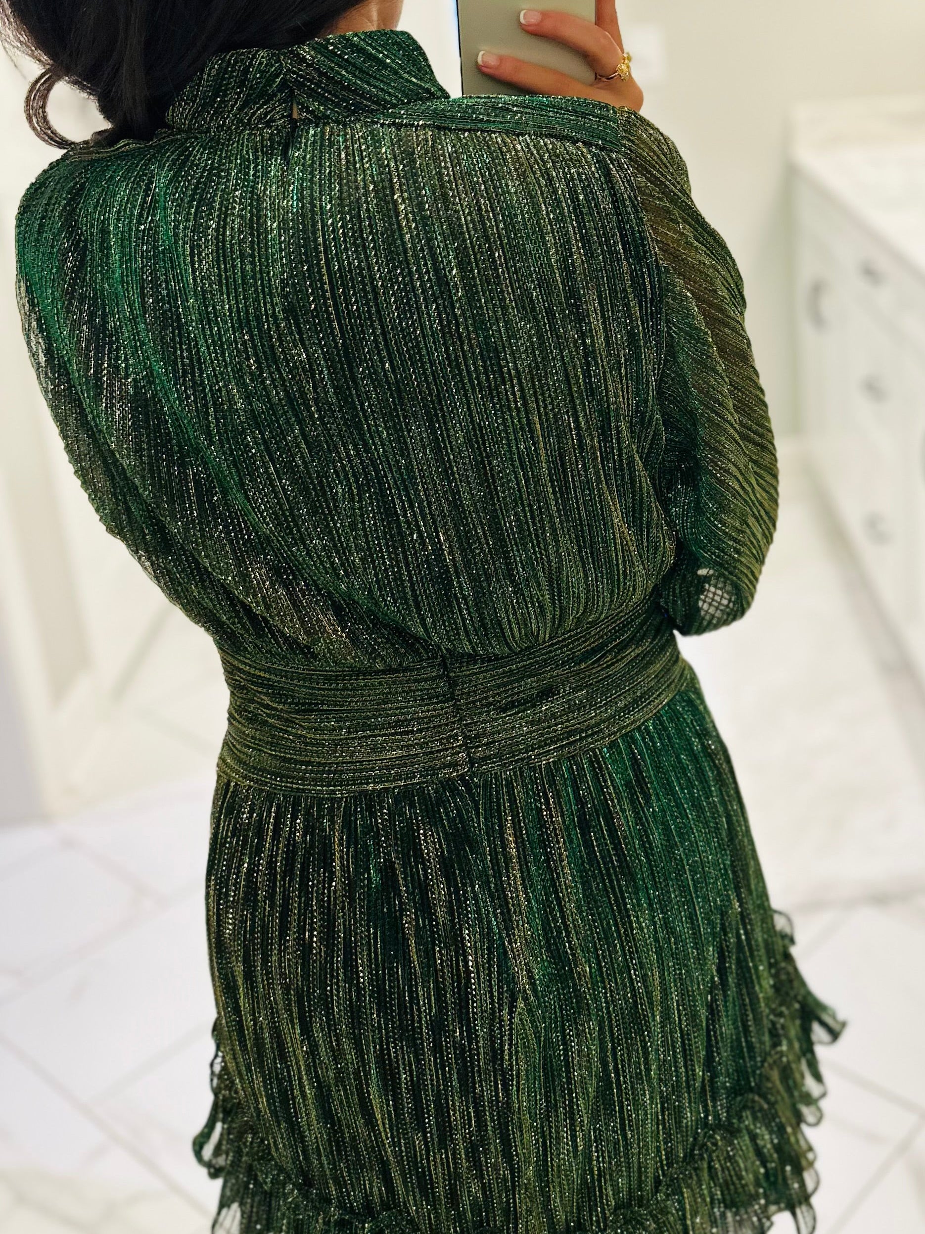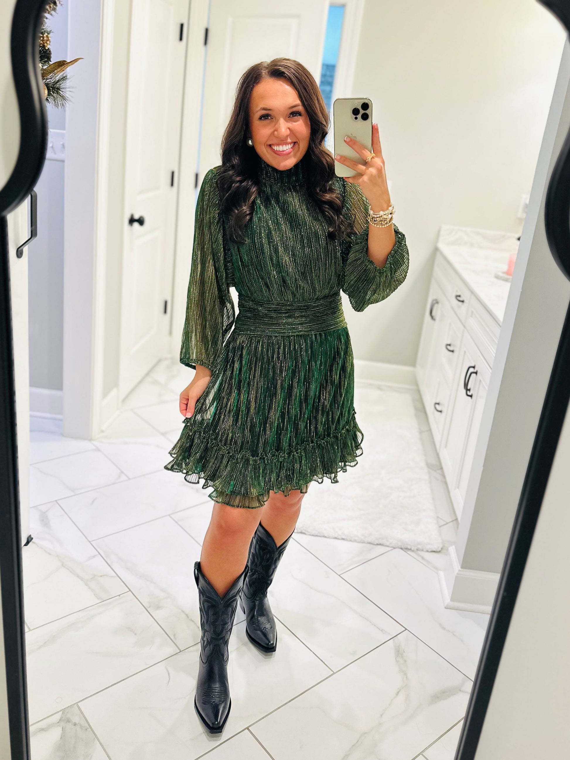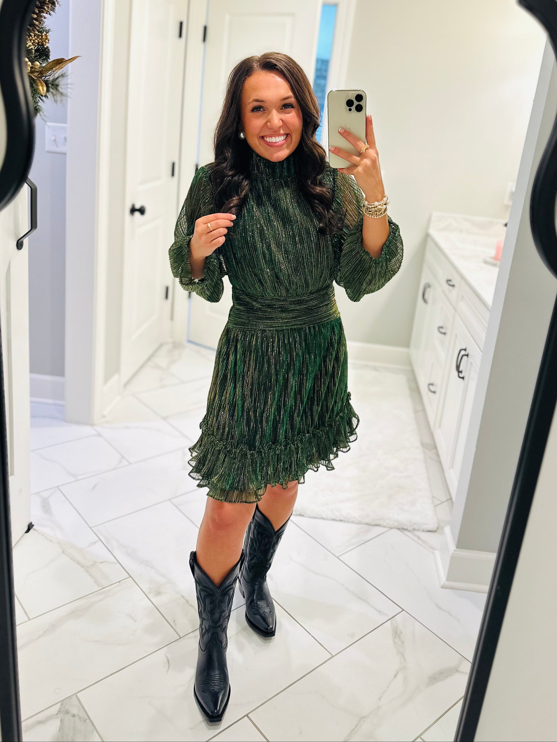 Tis the season! This dazzling dress is the perfect addition to your wardrobe. This dress is fun, festive, and oh so cute. This dress features a ruffle hem, long sheer sleeves, and a metallic pleated fabric that catches the light. It has a fitted waistband and a back invisible zipper for a seamless look. ✨