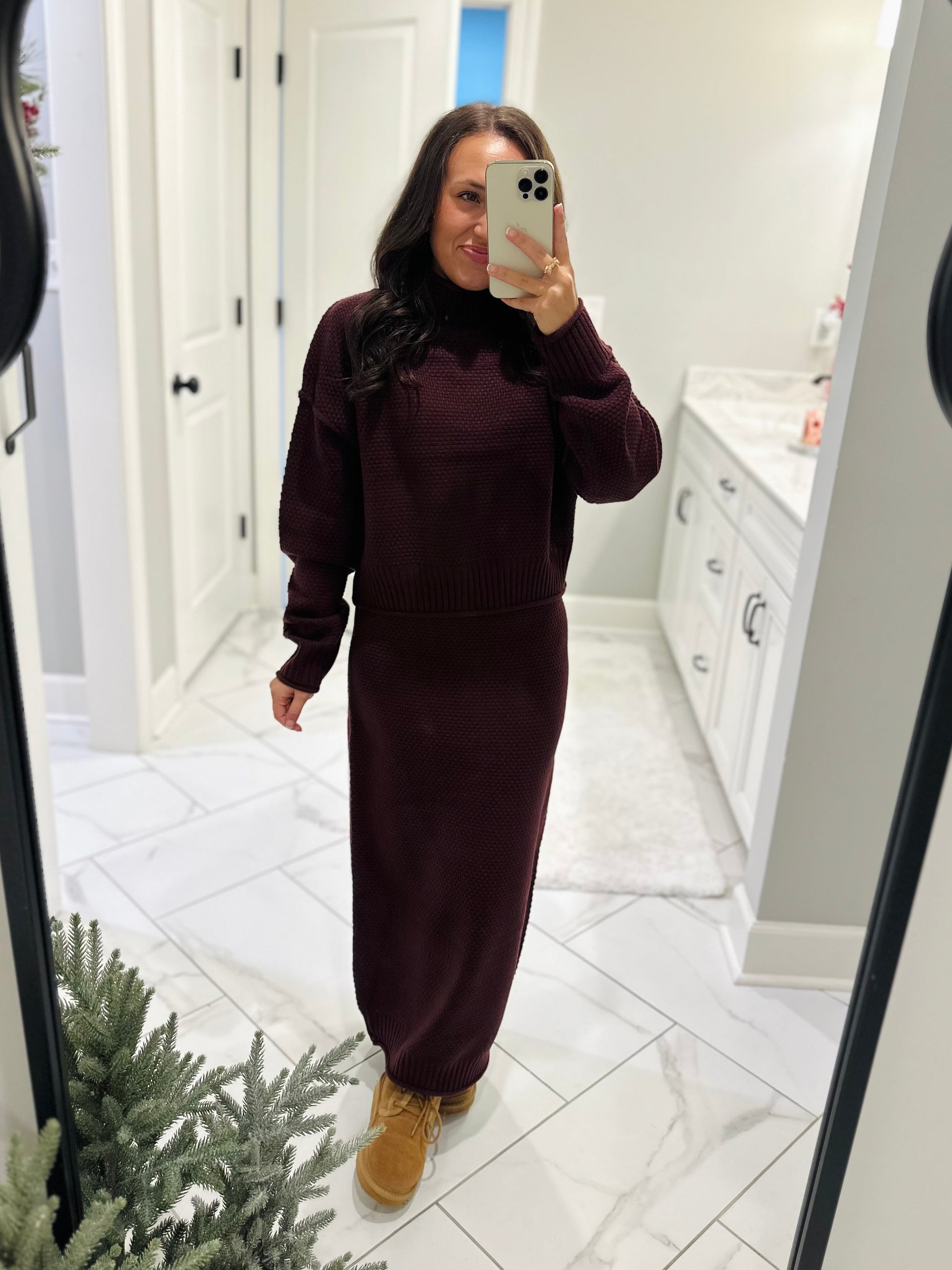 Effortlessly chic and oh so classy in our new sweater and skirt set! This are the perfect everyday sets as you can dress them up or keep them casual. This coordinated set features a textured high neck sweater and a matching long skirt that offers both comfort and style. Its relaxed fit is ideal for layering, making it perfect for chilly days or casual evenings. Pair with minimal jewelry and loafers for a polished look. The versatility ensures it can transition from office to outings effortlessly.