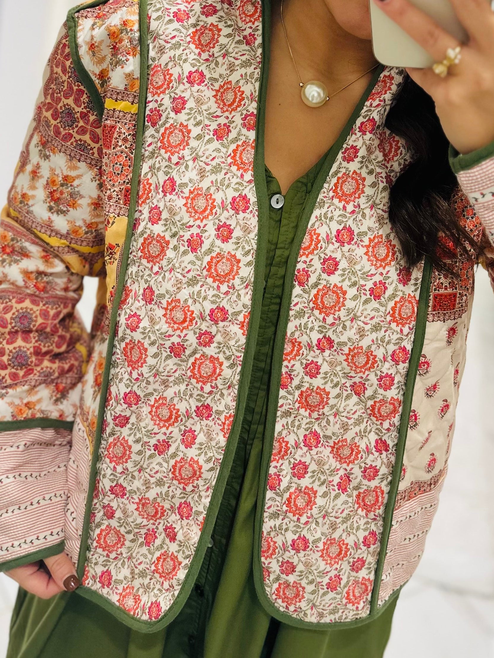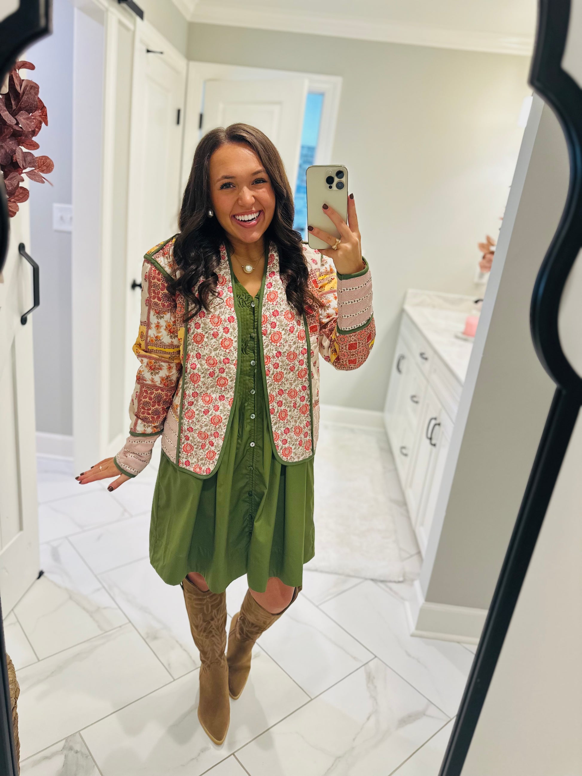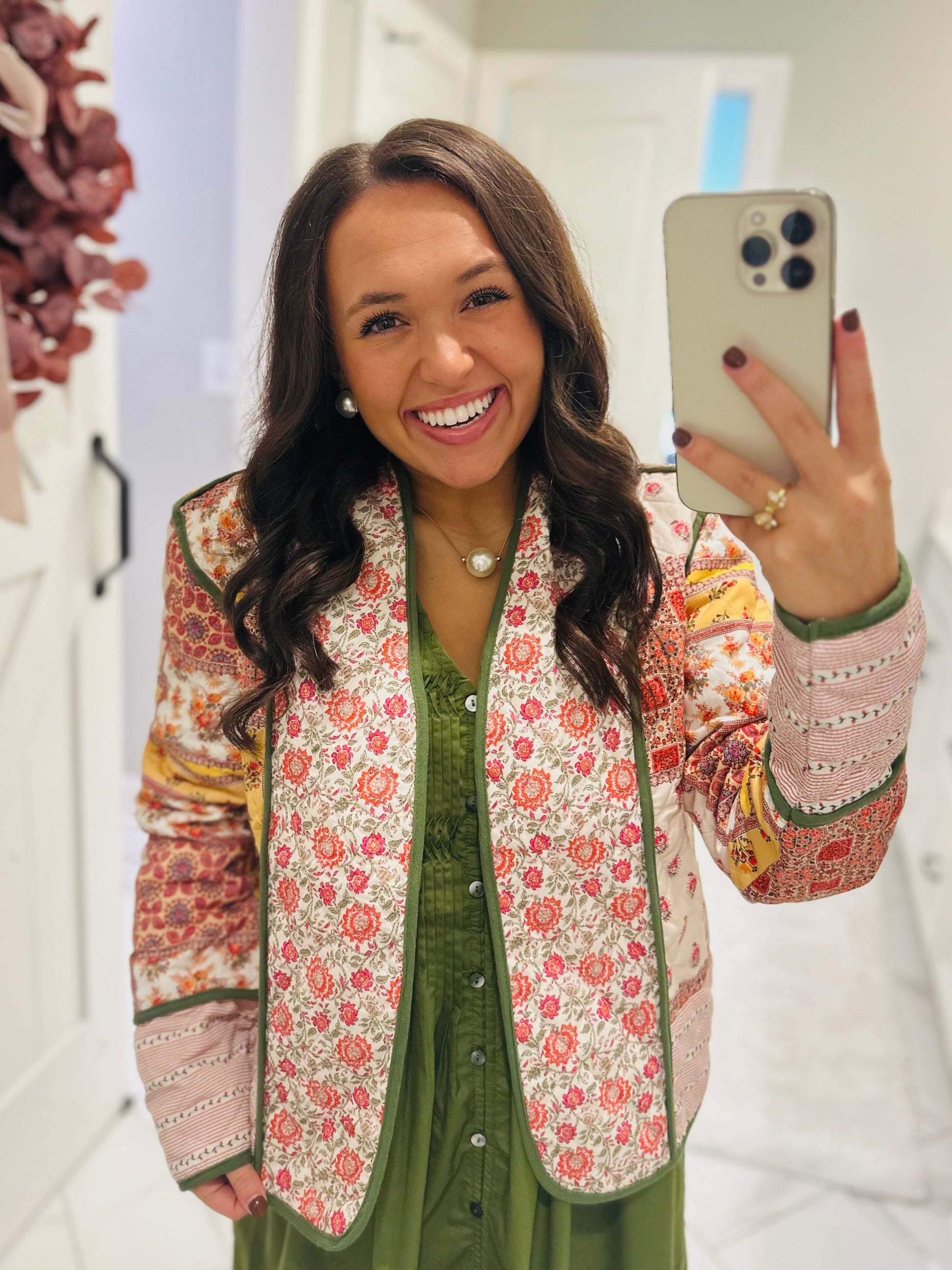 Cozy, cute, and quilted. This new jacket is adorable! Featuring a green and red mustard multicolor floral and patchwork pattern, long sleeves, and quilted material, this jacket is the perfect everyday staple. Layer it over tops, dresses, sweaters, and so much more!