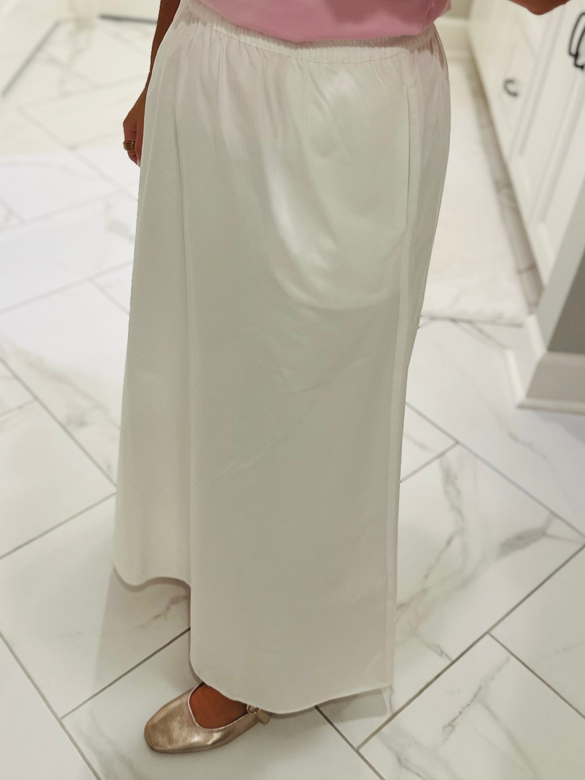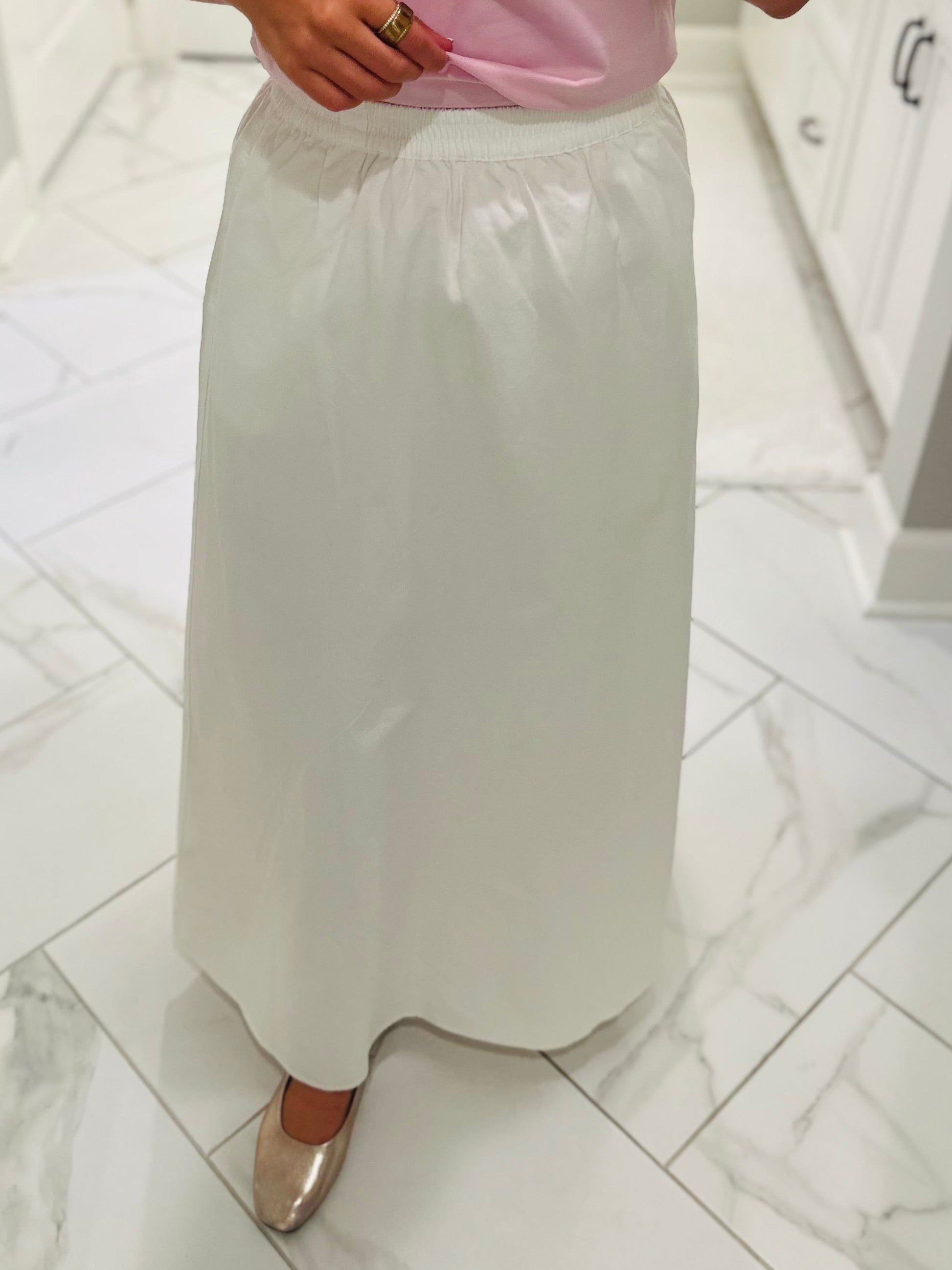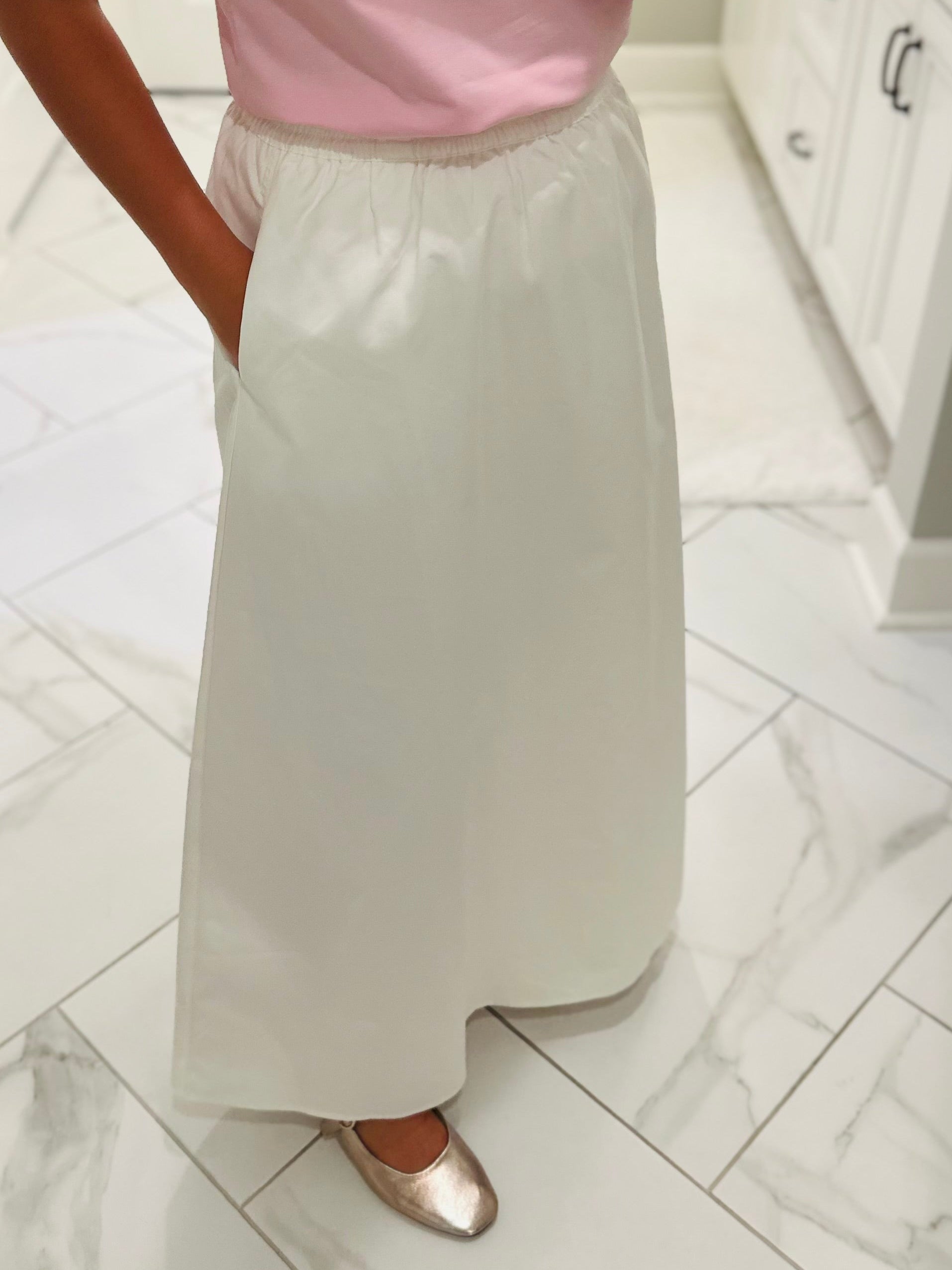 Effortlessly chic and oh so comfortable 🤍 Our new white midi skirt is the perfect piece to add to your wardrobe! It is crafted from soft, 100% cotton, making it comfy and breathable. This skirt features a bright white color, an elastic waistband, and a flattering silhouette. It even has pockets! This skirt is versatile and easy to wear casual or dressed up. We recommend to style this skirt with tees, blouses, or lightweight sweaters for an easy, chic outfit.
