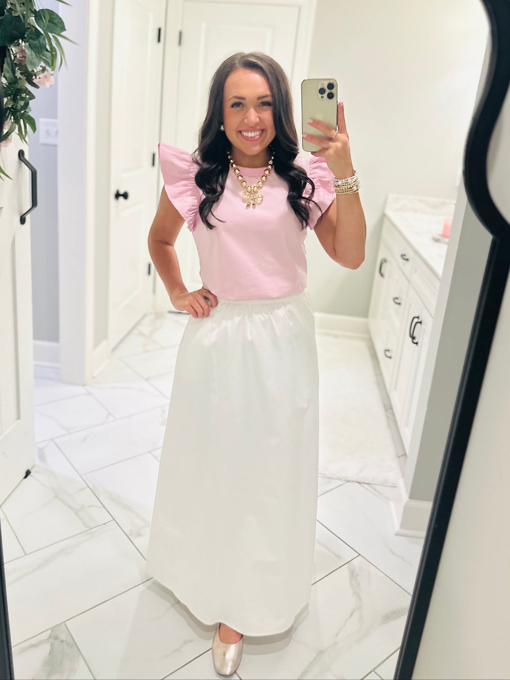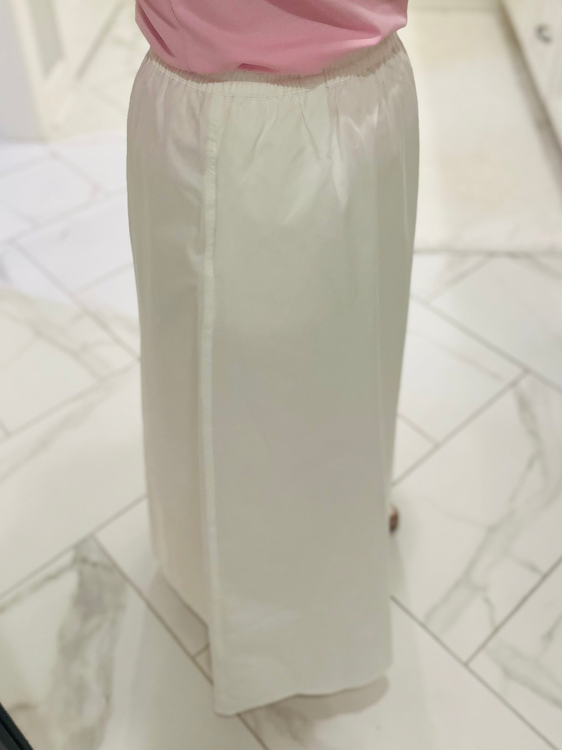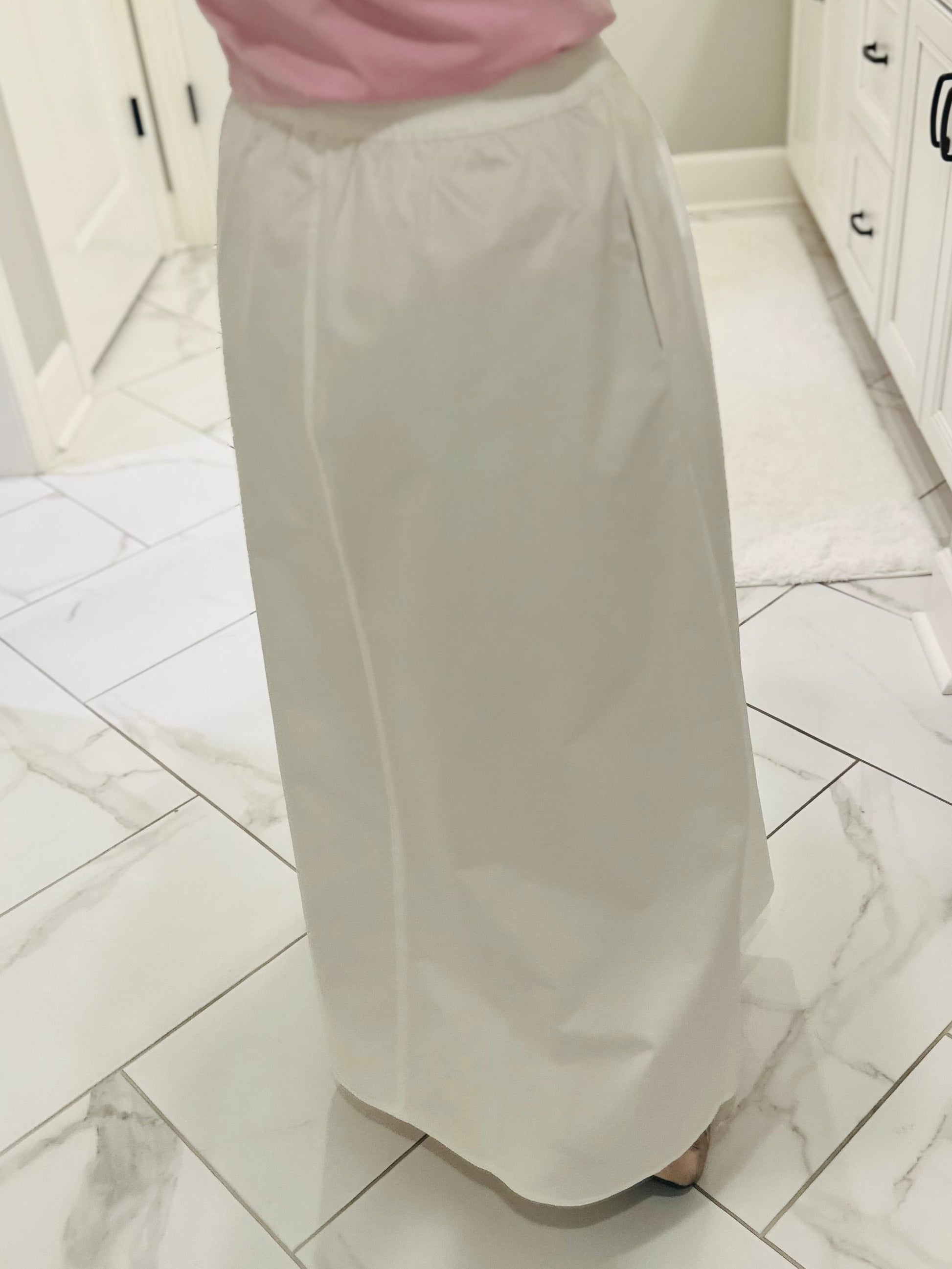 Effortlessly chic and oh so comfortable 🤍 Our new white midi skirt is the perfect piece to add to your wardrobe! It is crafted from soft, 100% cotton, making it comfy and breathable. This skirt features a bright white color, an elastic waistband, and a flattering silhouette. It even has pockets! This skirt is versatile and easy to wear casual or dressed up. We recommend to style this skirt with tees, blouses, or lightweight sweaters for an easy, chic outfit.