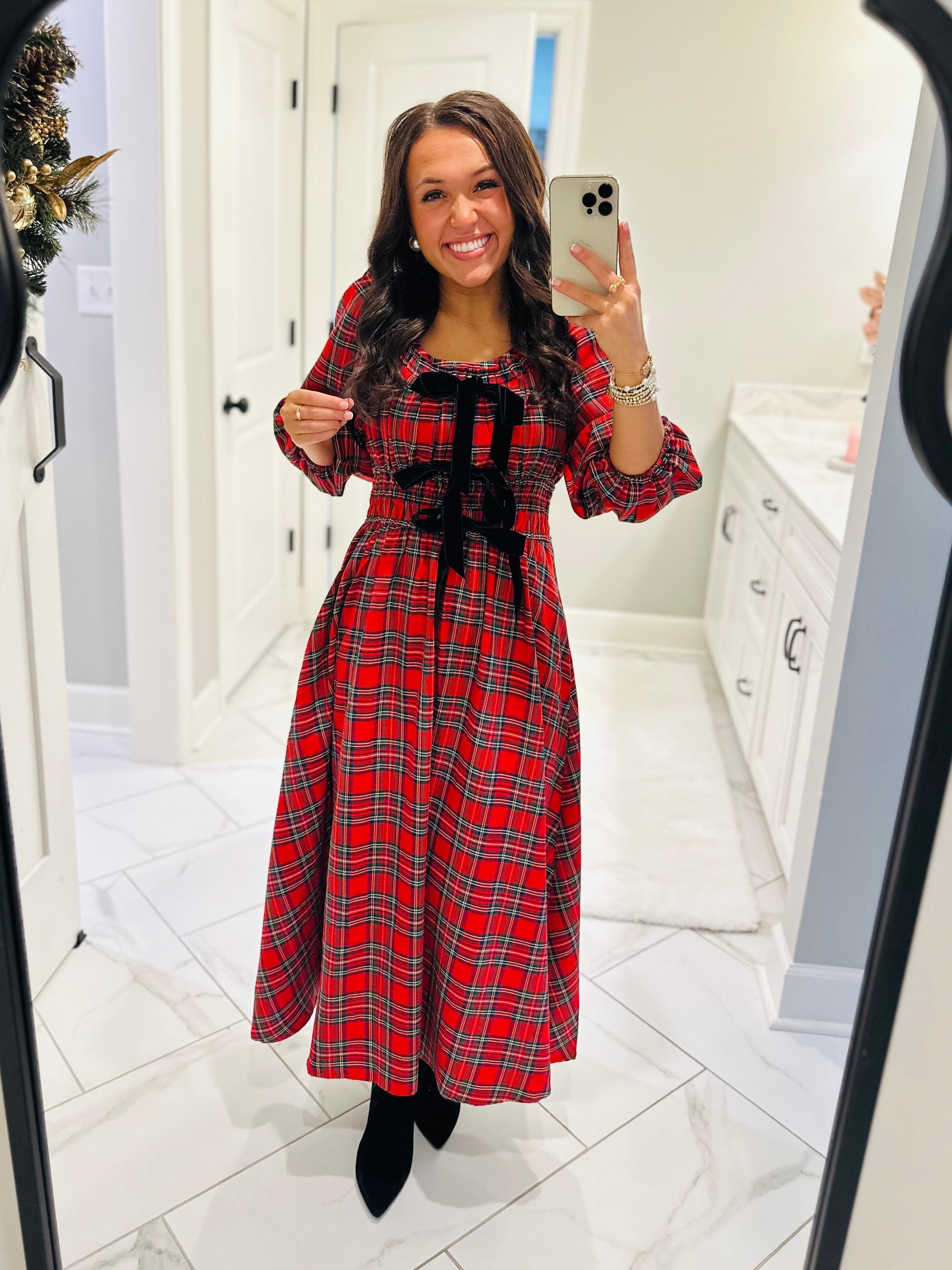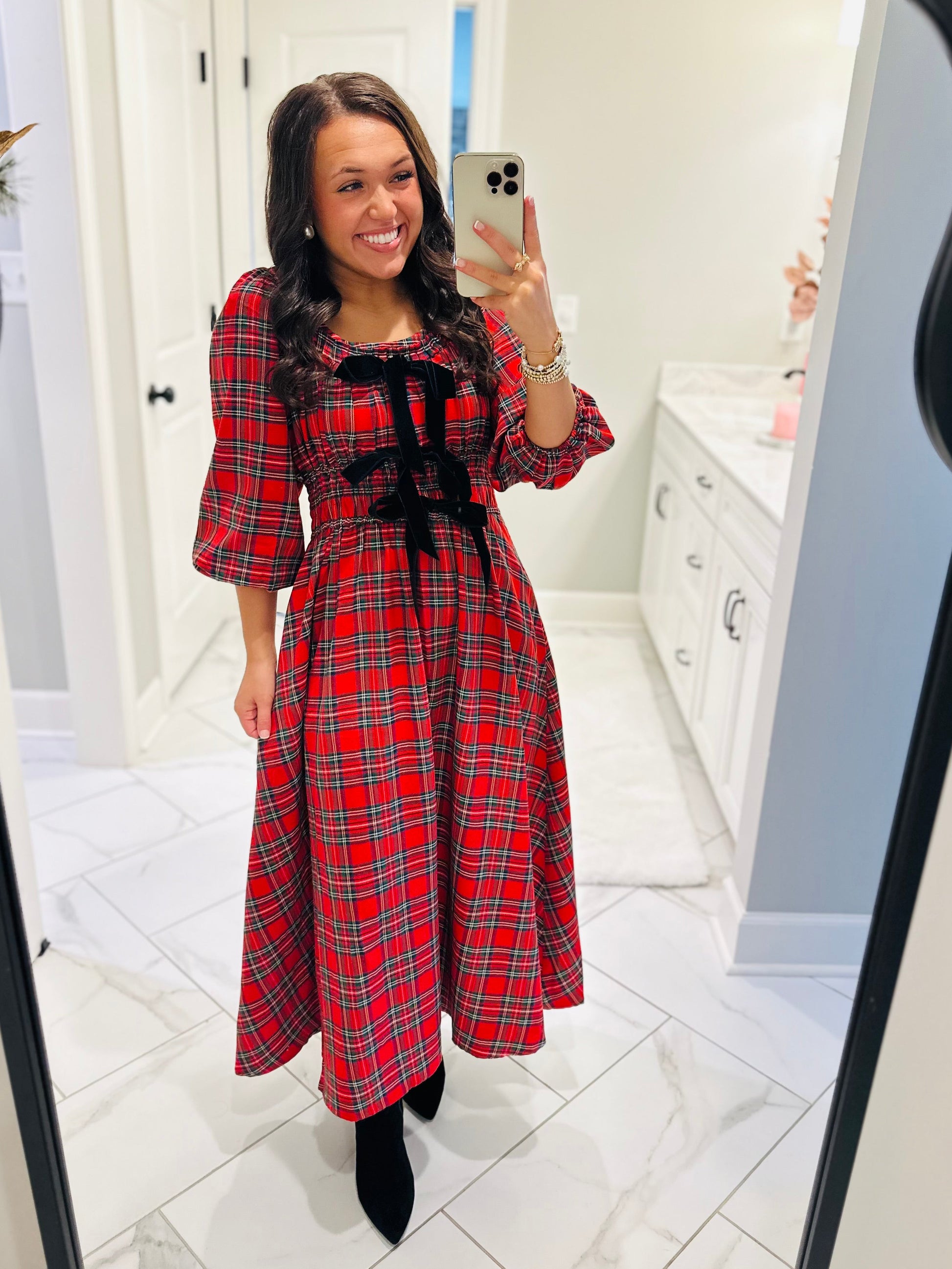 'Tis the season for all the cute holiday plaid! Get ready for the holiday season with this gorgeous red holiday plaid midi dress. This dress features the cutest triple black velvet bow detail at front, 3/4 length sleeves, an elastic waistband, and side pockets. It is the perfect festive dress. Style with heels or booties!