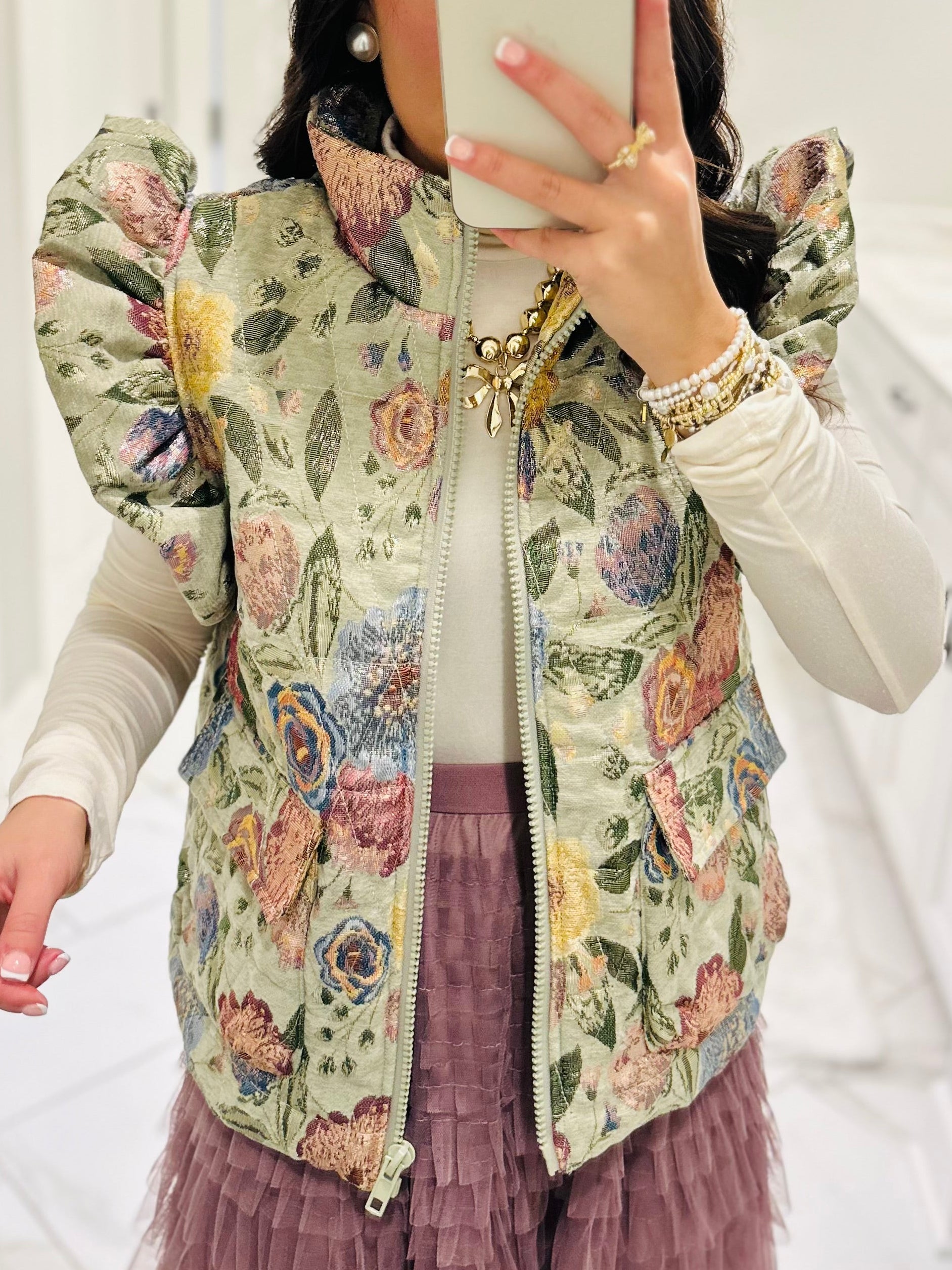 LADIESSSSS!!!! This new vest is a must-have. This vest features a beautiful olive green and multicolor floral print with metallic shimmery detail. It is quilted, has ruffle sleeves, pockets, and a front zipper. This statement vest is perfect to wear with tops, dresses, or pullovers. It is THE moment! ✨