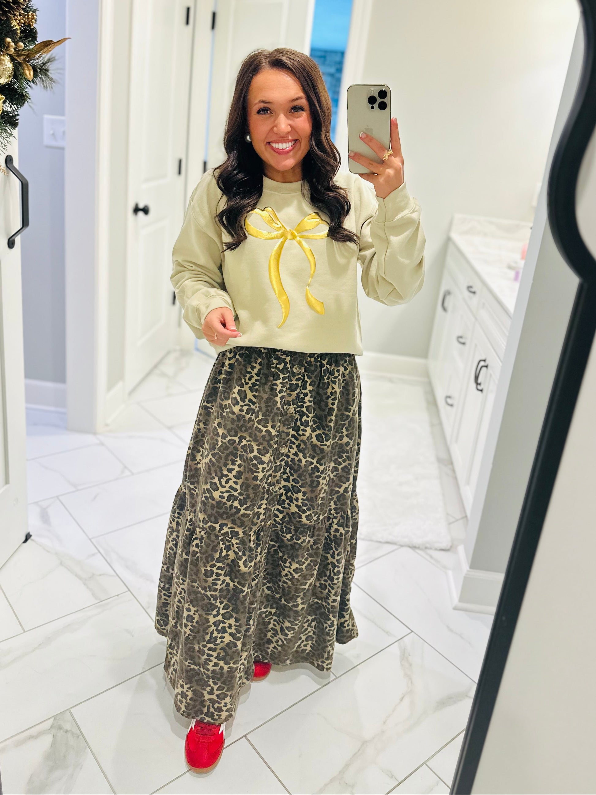 LEOPARD SKIRT SHOWN STYLED WITH CREWNECK: