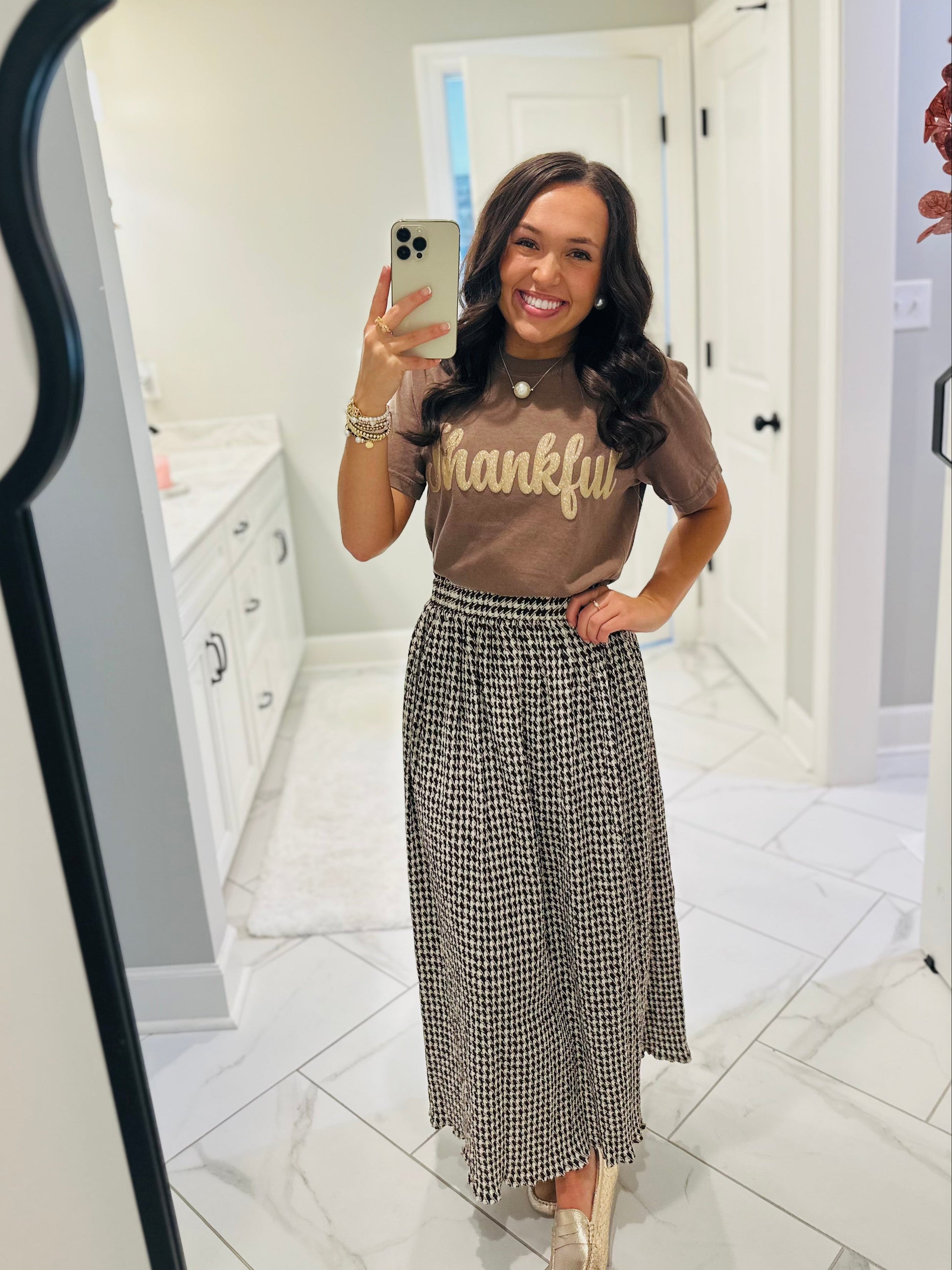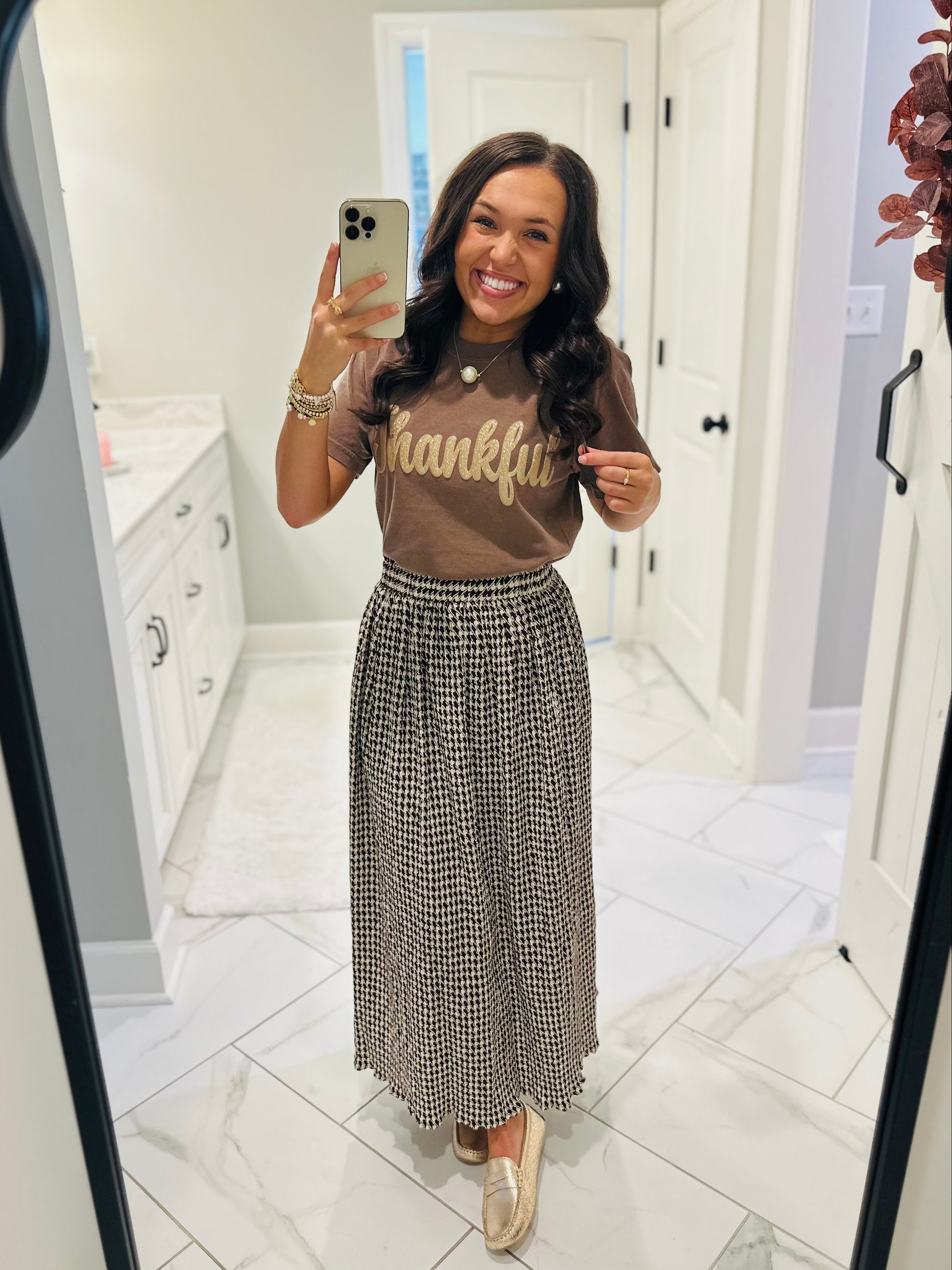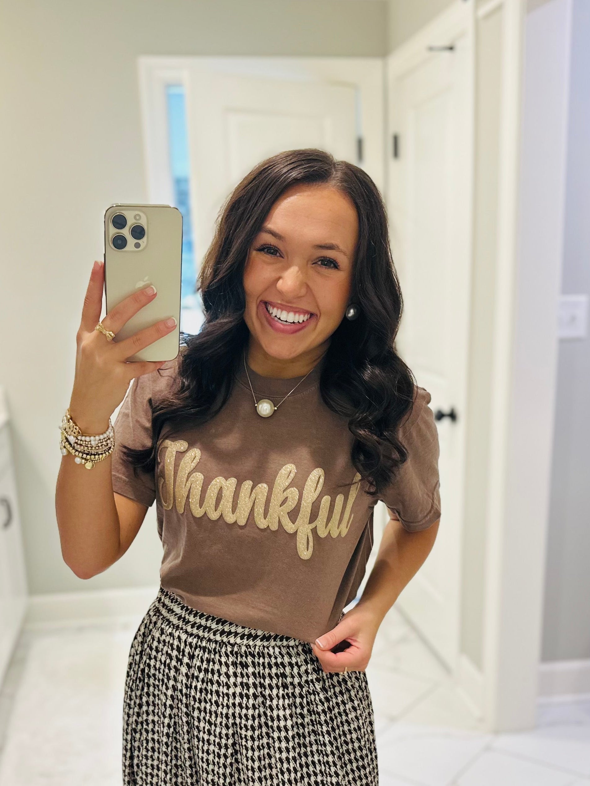 There's so much to be thankful for! This tee features a gold glitter 'thankful' design in puff ink on an espresso brown comfort colors tee. Layer a cardigan or shacket over this tee or a turtleneck underneath it for the perfect fall outfit. This tee is simple but yet so adorable.