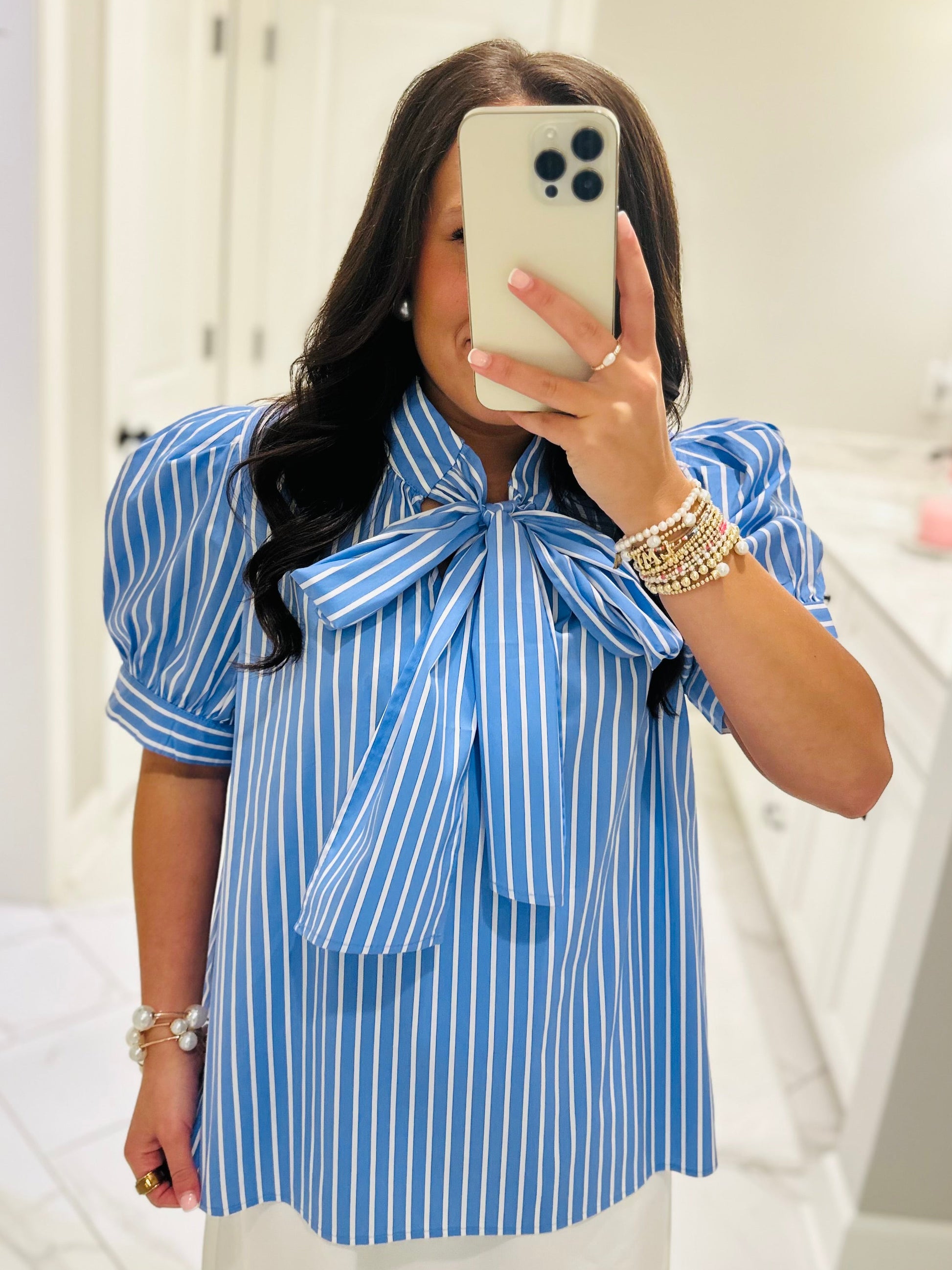 The CUTEST top ever has arrived to LMB!! This top features a classy and elegant blue and white striped print with short puff sleeves and a bow tie neckline. This top has a relaxed and flattering silhouette. Dress it up or keep it casual. This top is a staple piece for your wardrobe!