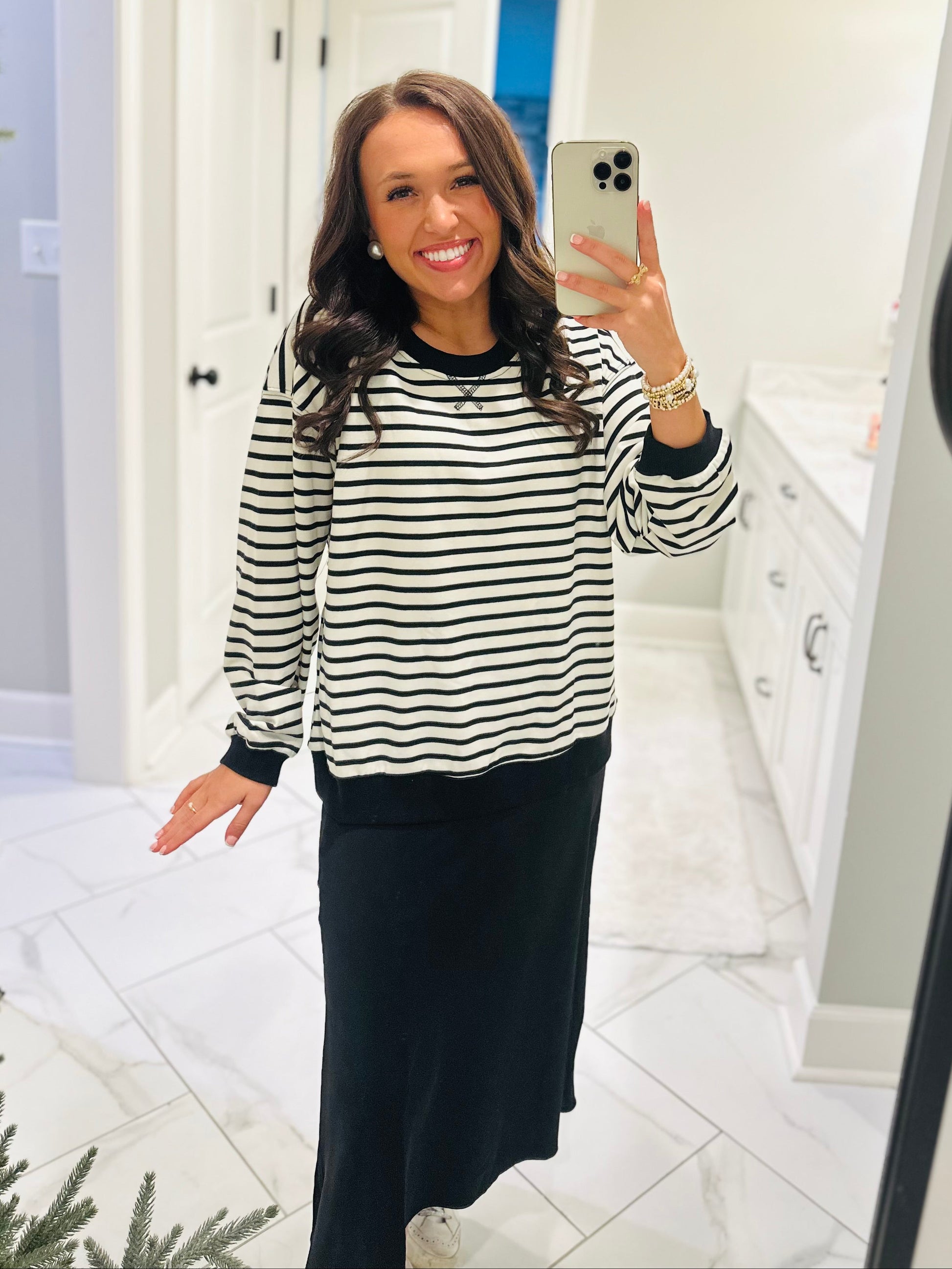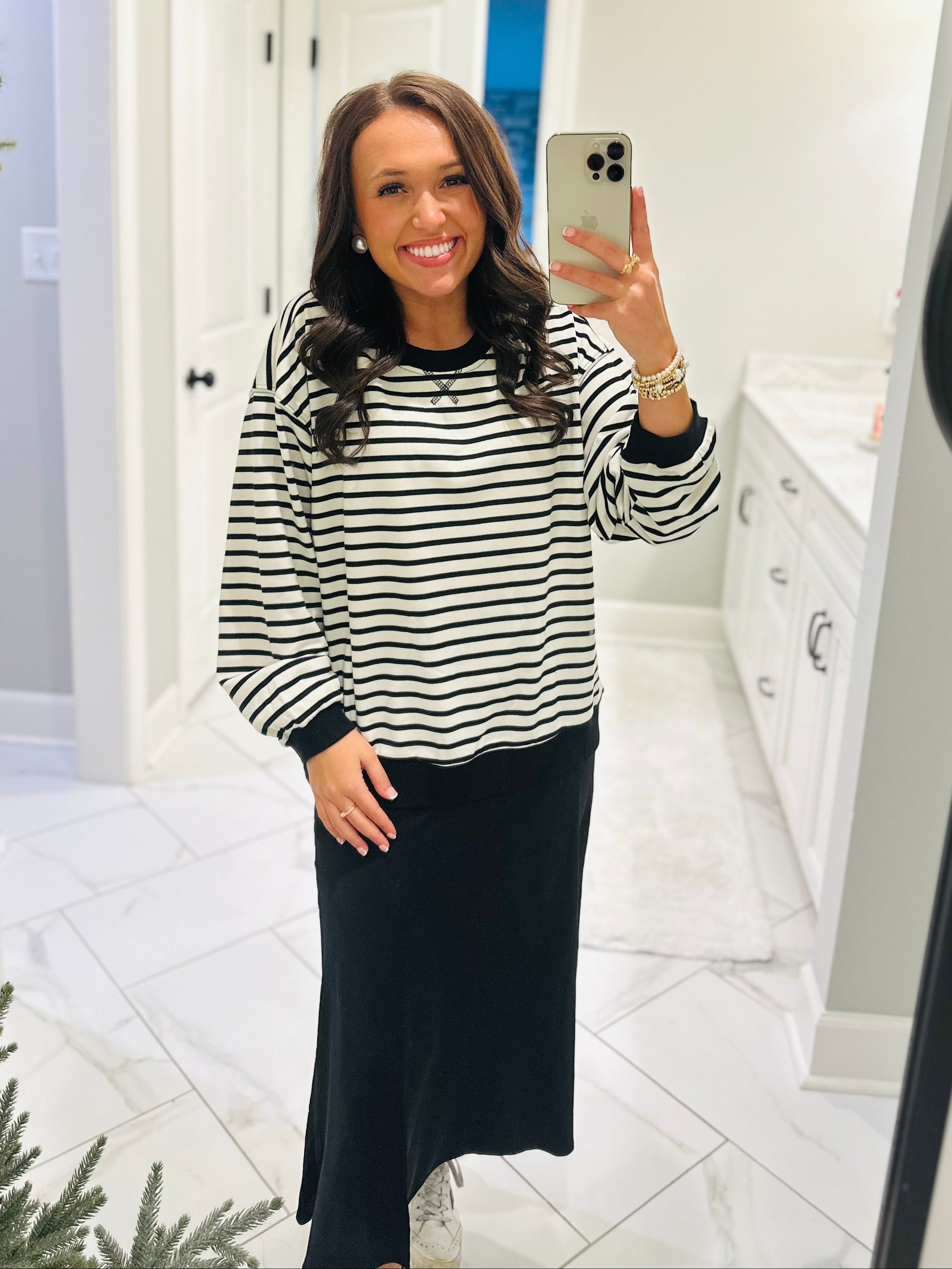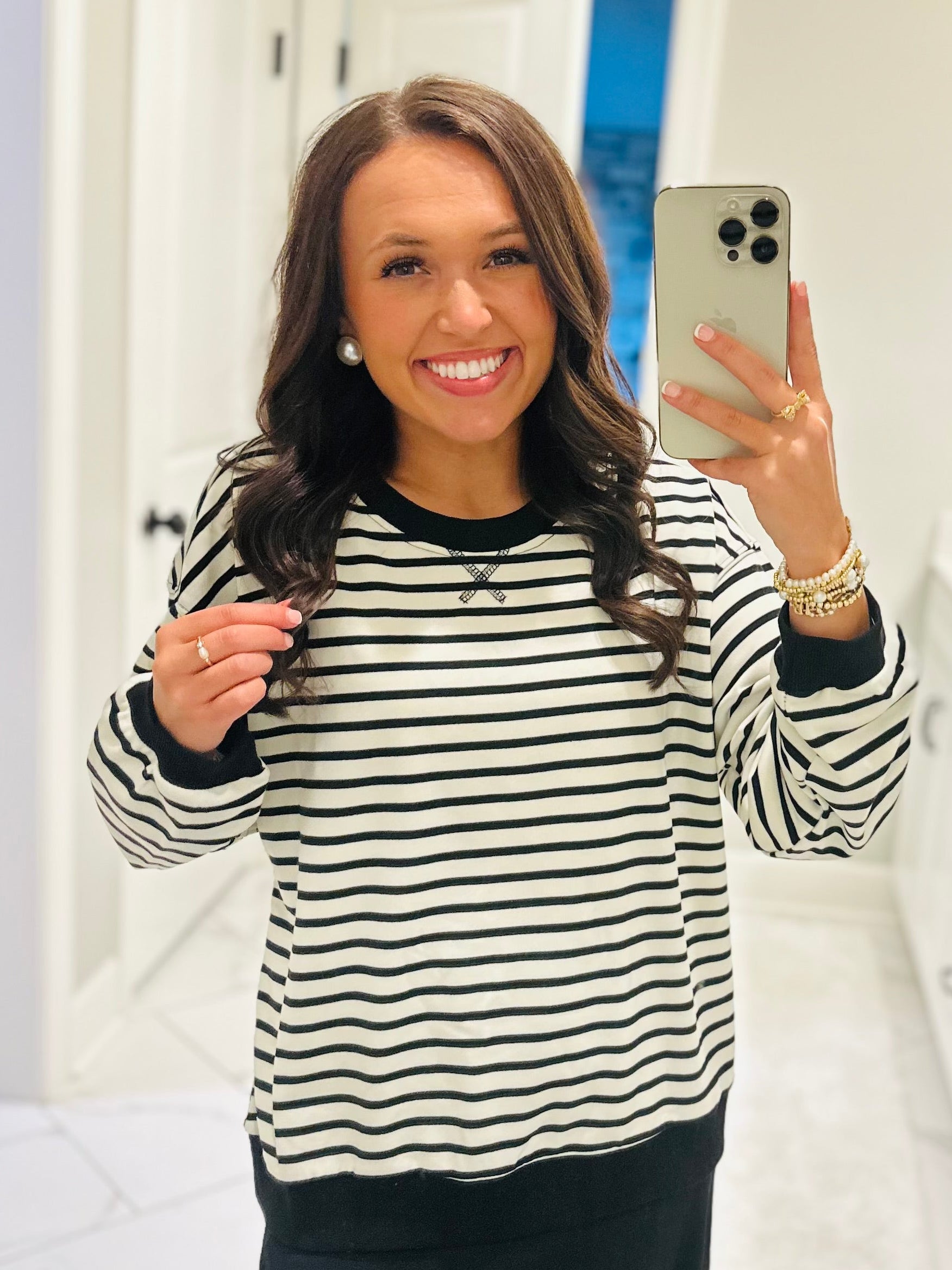 Stay comfy and cozy in this new pullover! This top features a pretty ivory and black striped design with a round neckline, ribbed hem, and long sleeves with a ribbed cuffs. It's SO soft and such a great pullover. These won't last long - snag one now because they're perfect for everyday!
