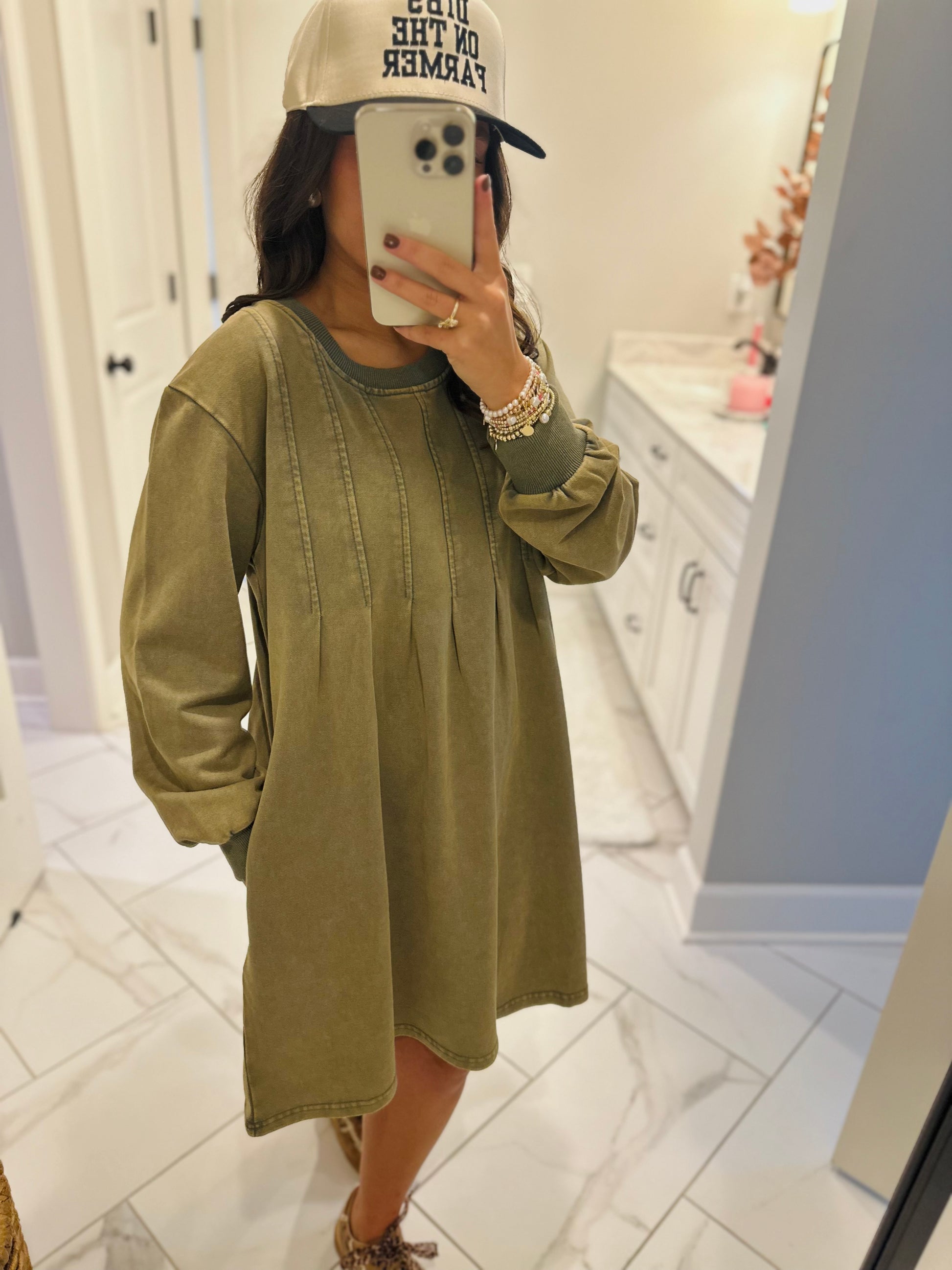 The perfect everyday casual dress has arrived! This cutie dress features a beautiful moss green mineral wash design, with long sleeves, pin-tuck detailing, and hidden side pockets. Style this dress now with sneakers and then later in the cooler months with leggings, a vest, and boots. It's cute, comfy, and a great staple for your wardrobe!