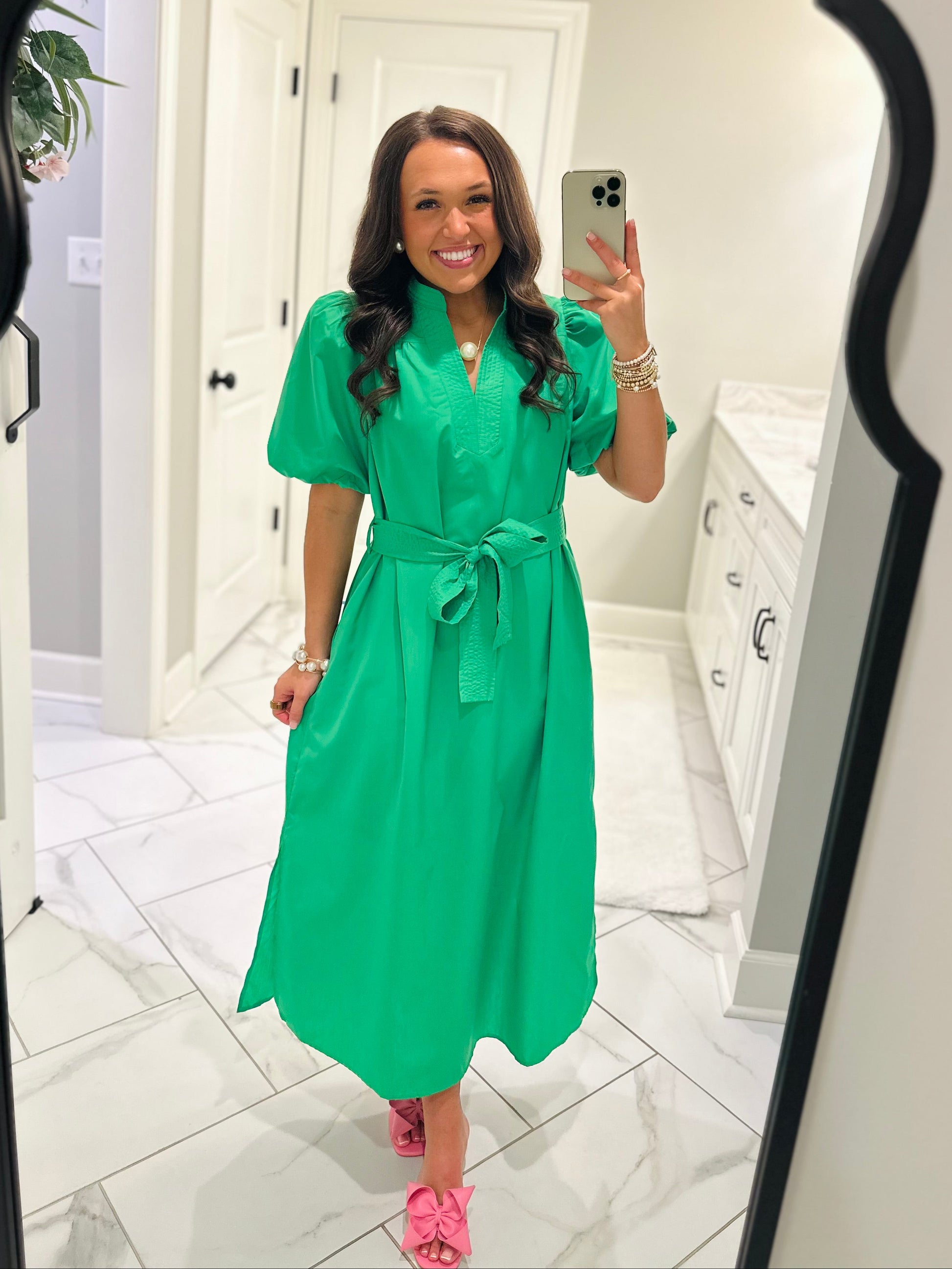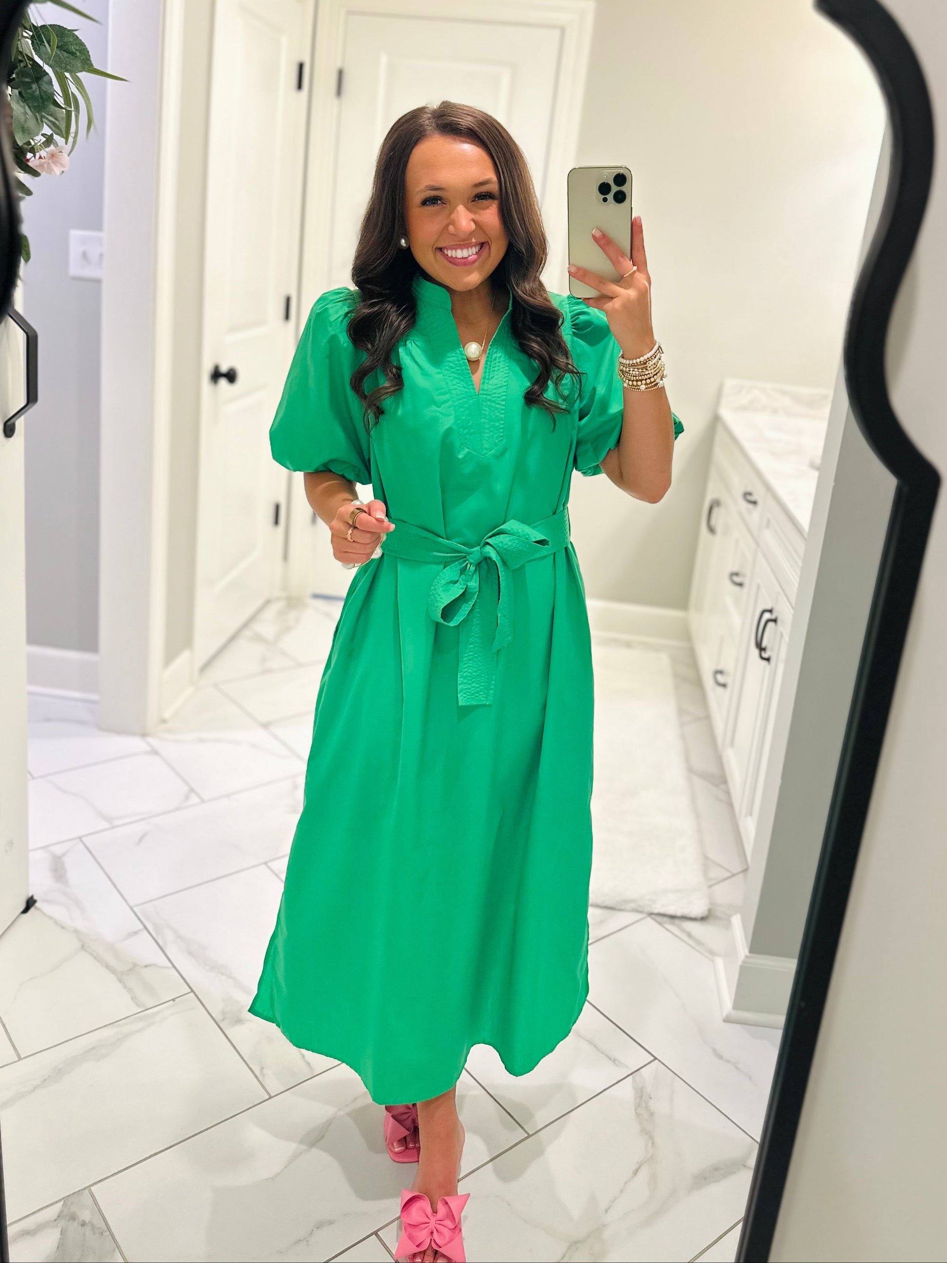 Fresh and vibrant, just like spring 💚 This adorable dress features a solid kelly green color with short puff sleeves, v-neckline, and a self-tie belt at waist. It also has pinktuck detailing on the neckline and belt. This adds the cutest detailing! This dress has side pockets and it is lined. Keep it casual with sneakers or dress it up with heels! The color and style of dress makes it so versatile.