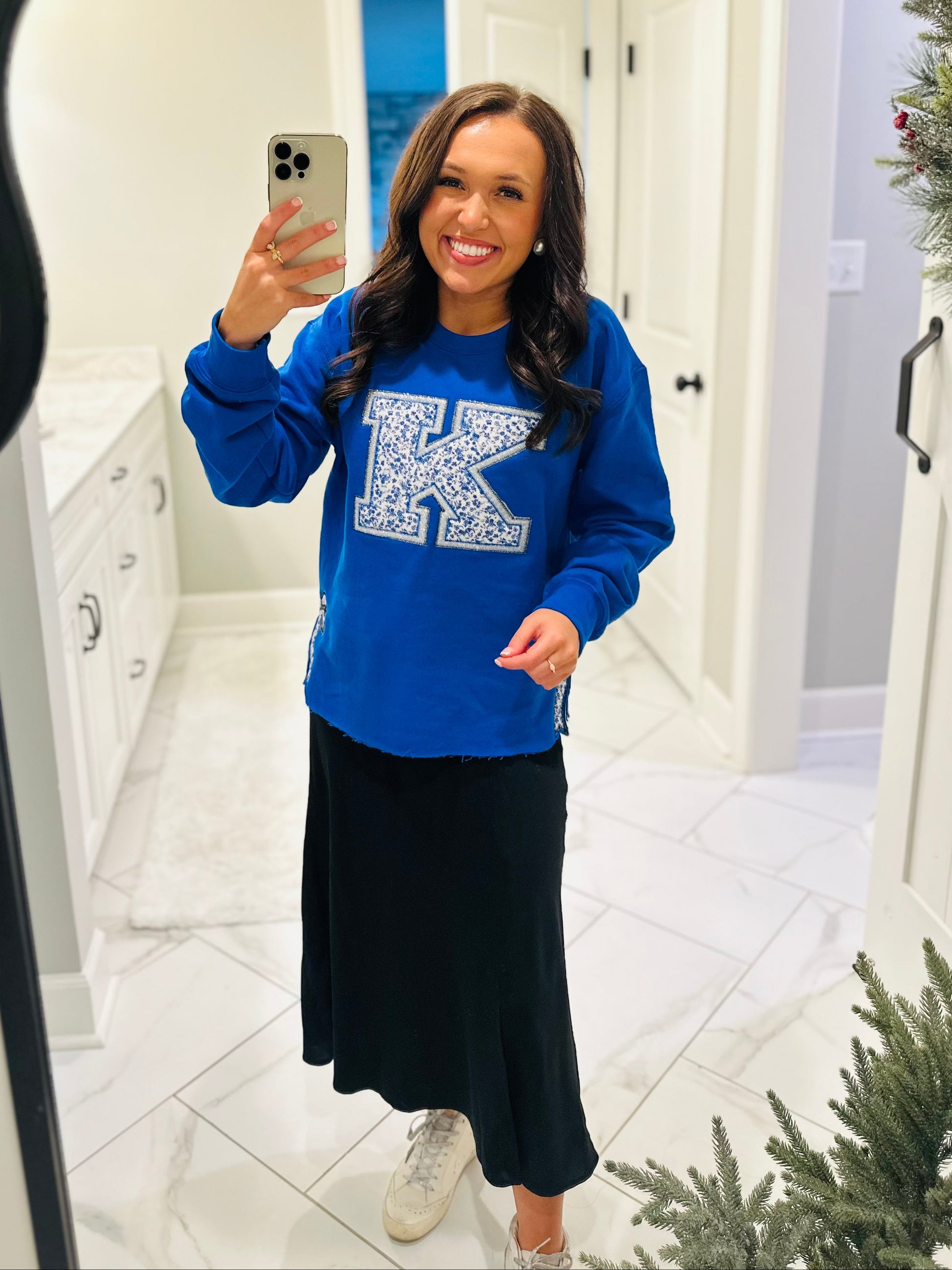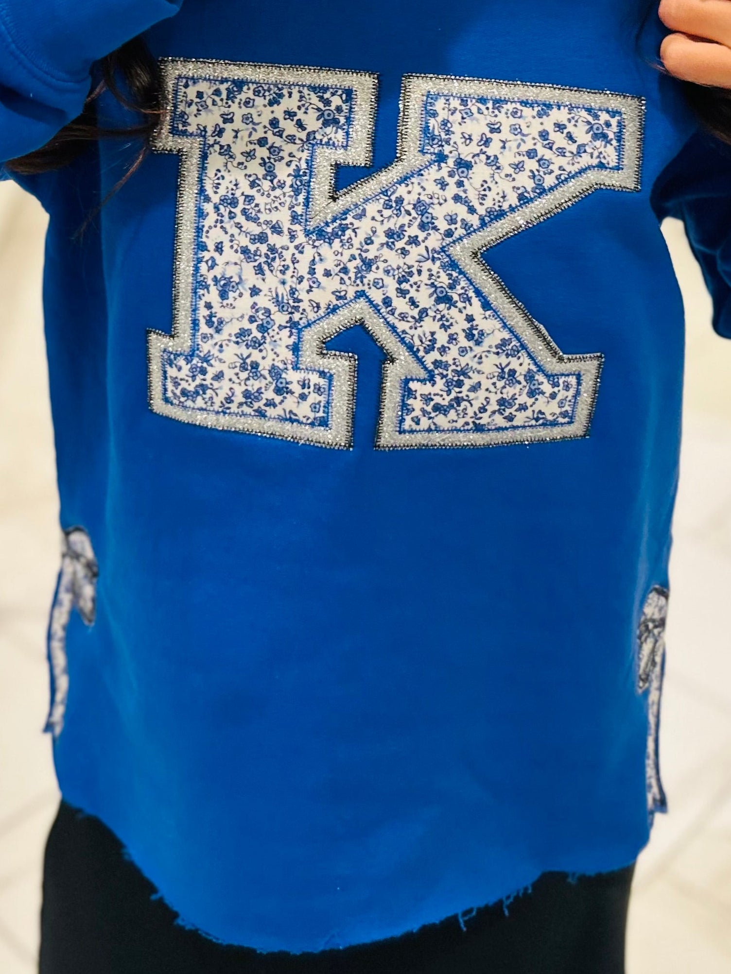 All cozy in Kentucky. 💙 This new sweatshirt is SO adorable! It features an embroidered floral and sequin "K" with embroidered bows on the side of the sweatshirt. It's fun, cute, and very unique. Perfect to wear cheering on the cats or just lounging around.Â