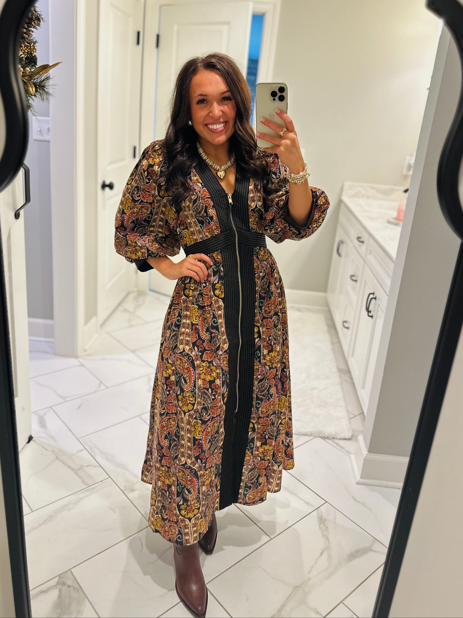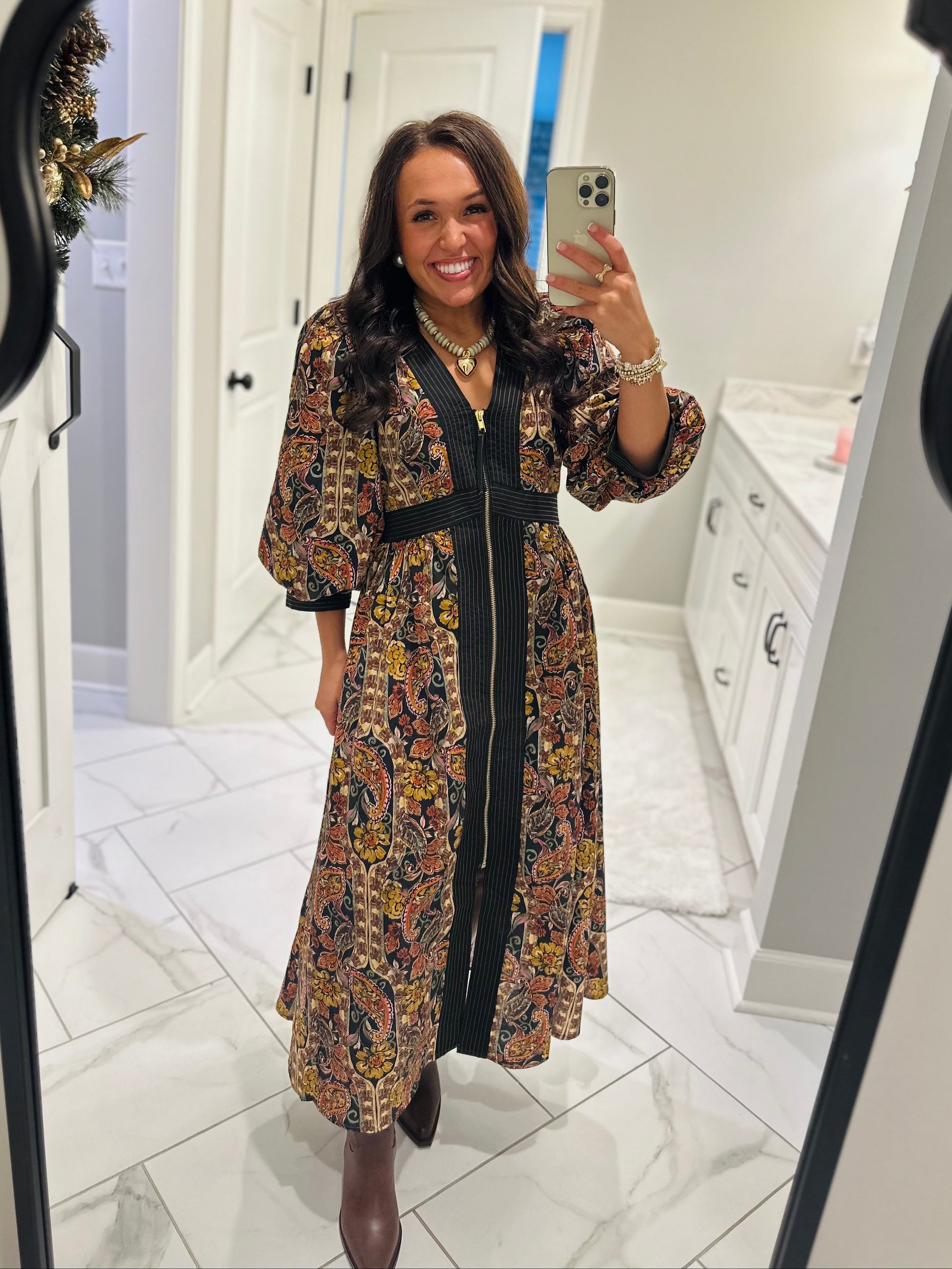New dress alert: featuring a flattering V-neckline and a stylish front zipper. This gorgeous midi dress is the perfect dress for every upcoming occasion. The print is beautiful, the fit is sooo flattering, and the dress is so easy to style. Wear it with sneakers or dress it up with booties!