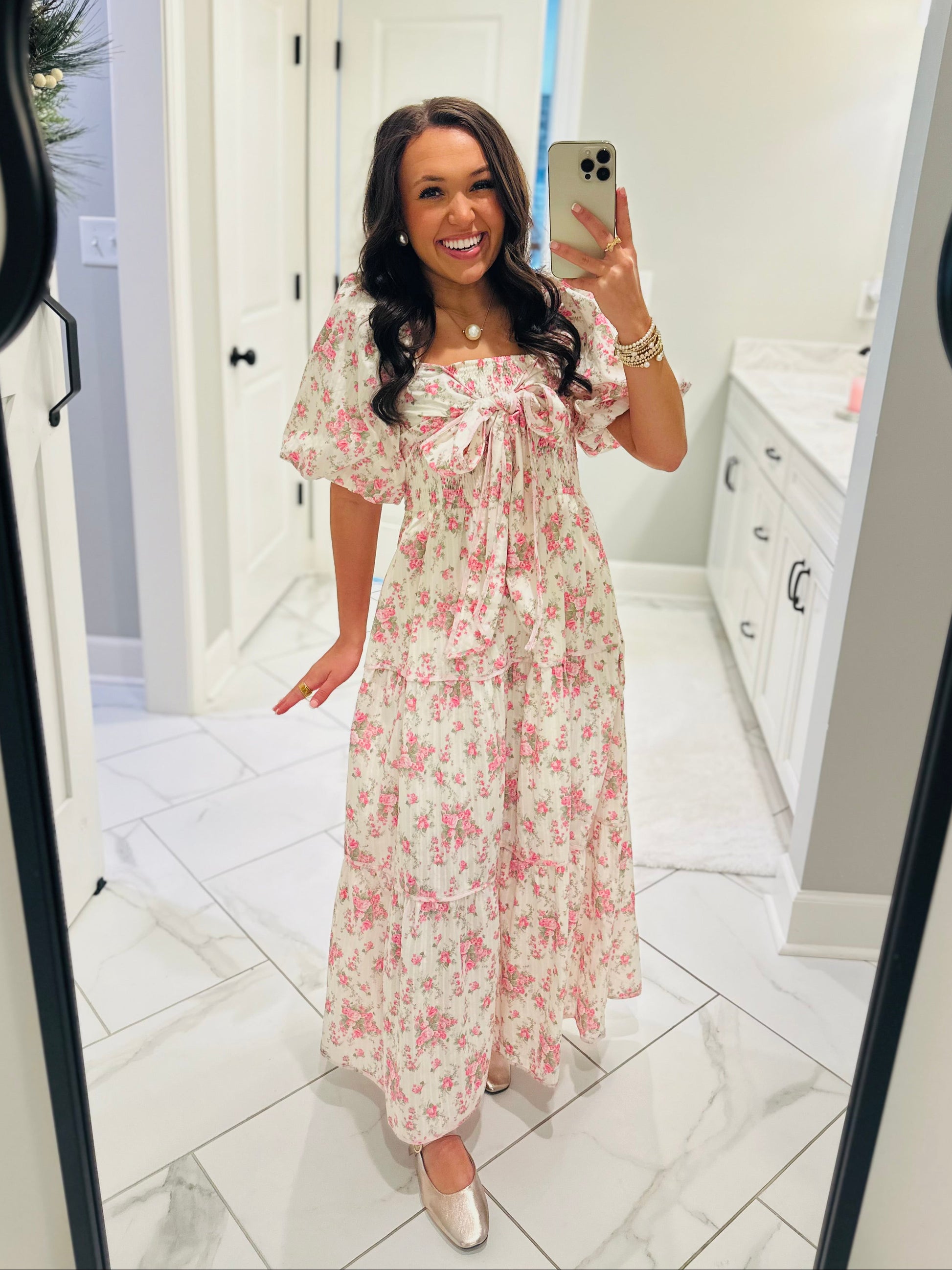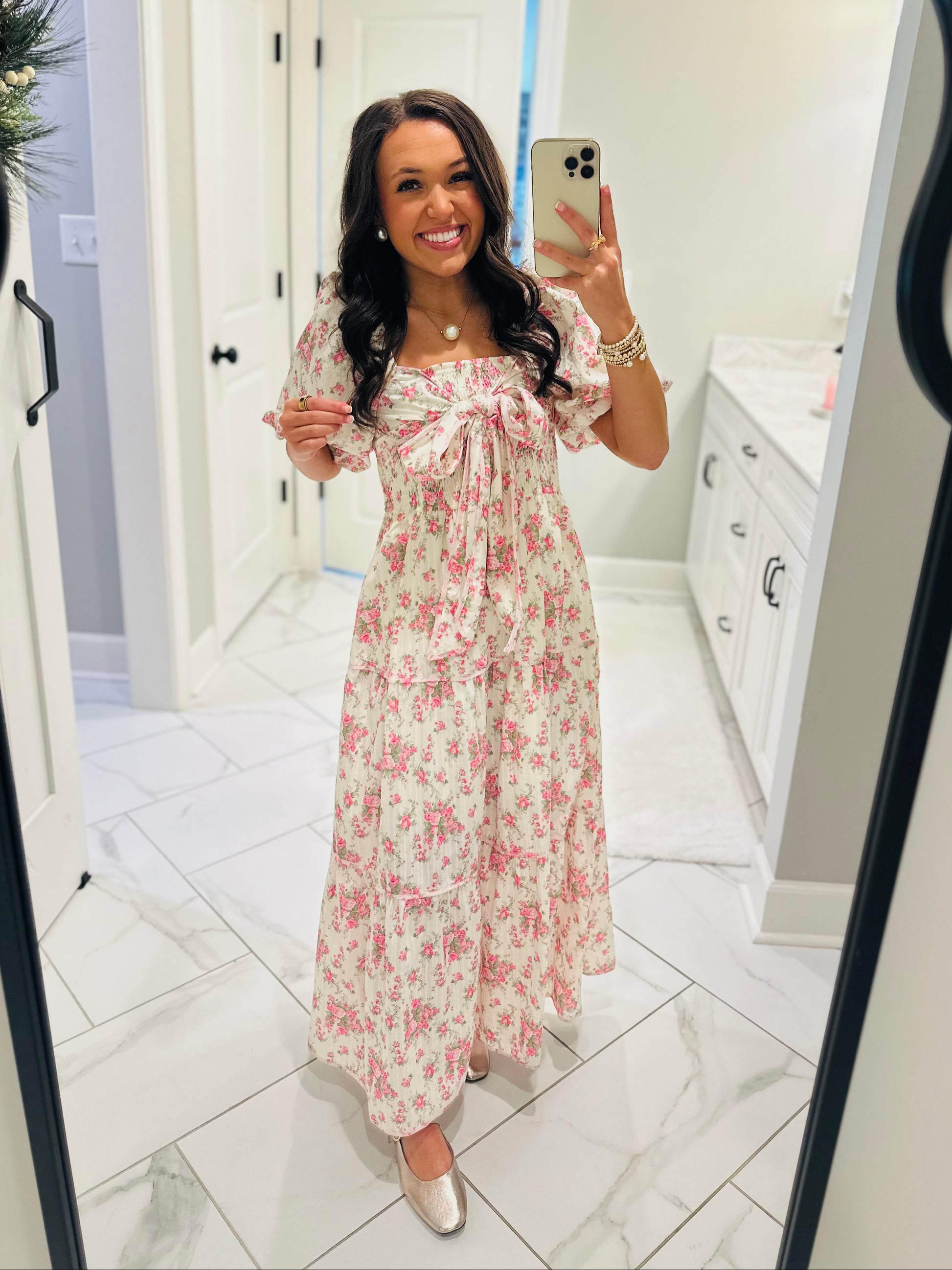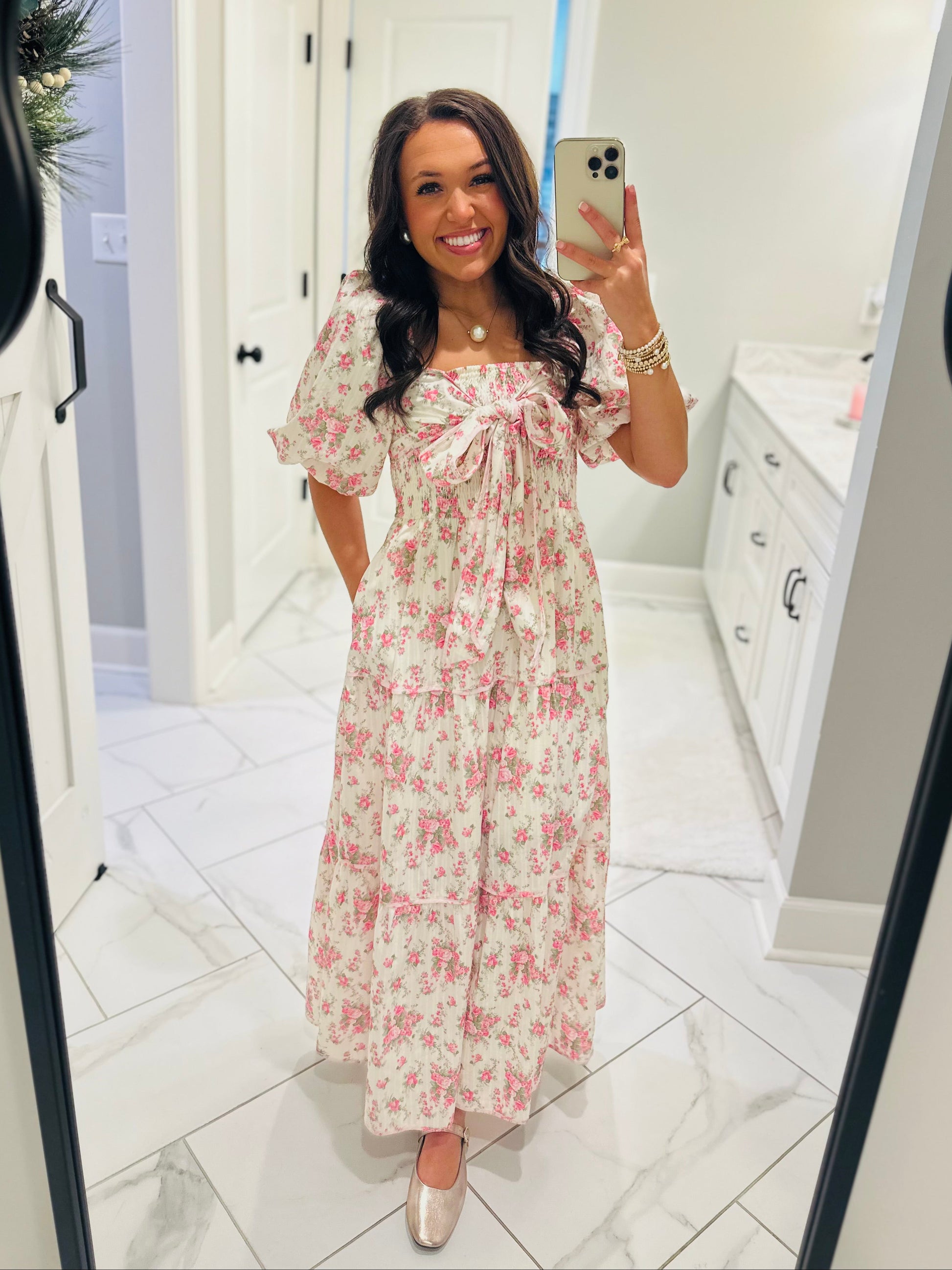 This dress is absolutely bow-tiful! This new arrival features a beautiful white and pink floral print with a smocked bodice and a front bow. It has fun puff sleeves and hidden side pockets. It's simply the perfect little dress for every occasion this spring and summer. Snag now, these wont' last long!