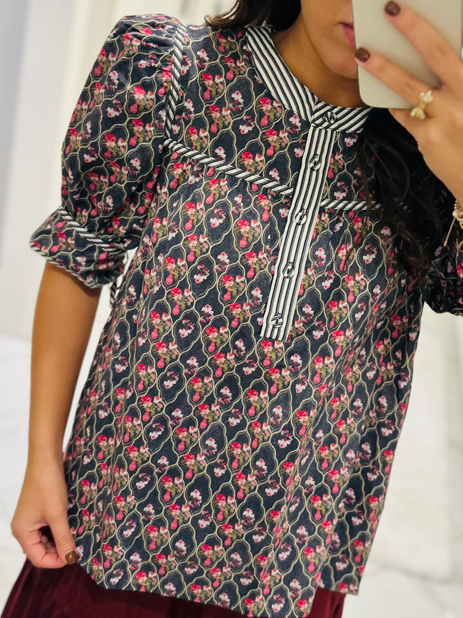 Give us all the pretty fall florals! This new top is so gorgeous. It features a navy multi-floral pattern with tie closure elbow-length puff sleeves. The contrast striped band and binding accent simply adds to the cuteness. This is such a classy top that is perfect for everyday wear this fall!