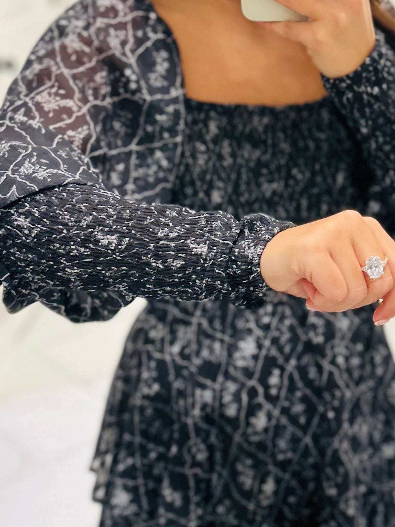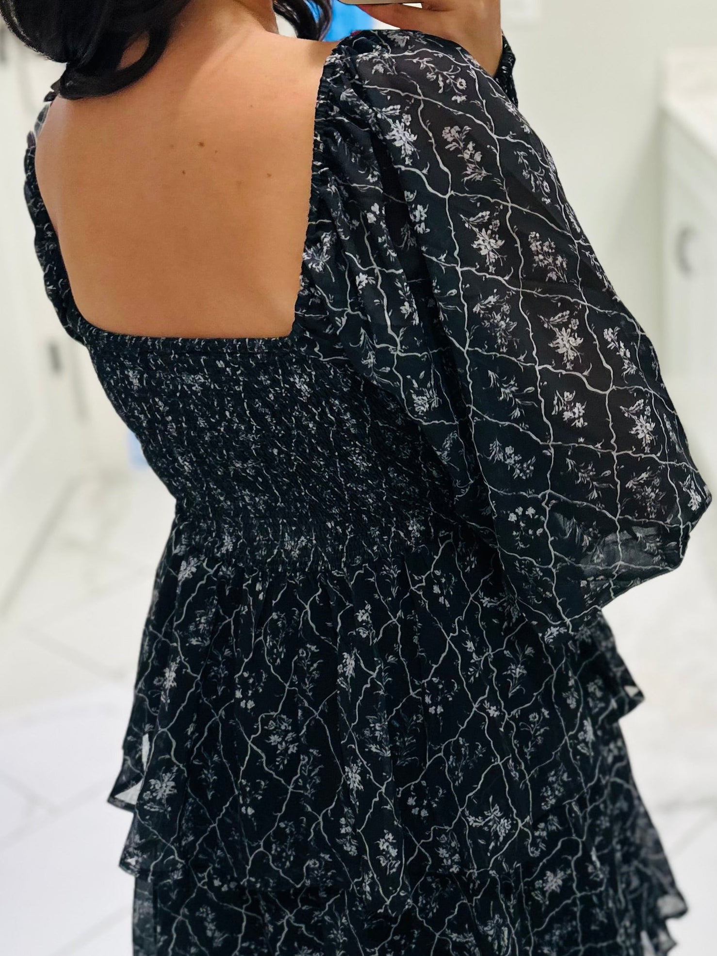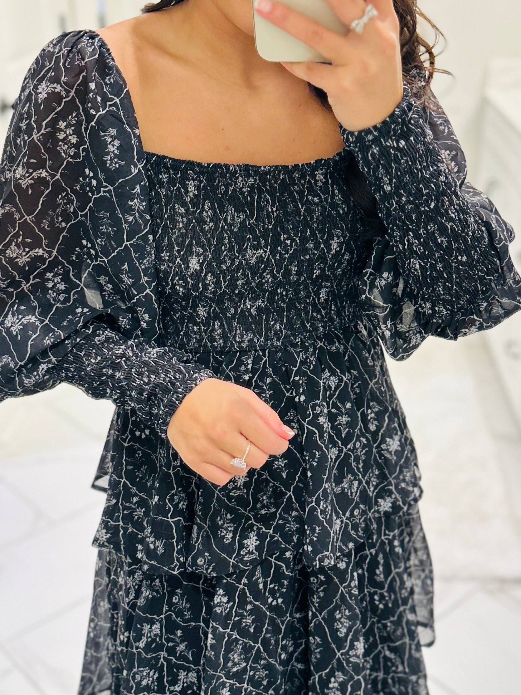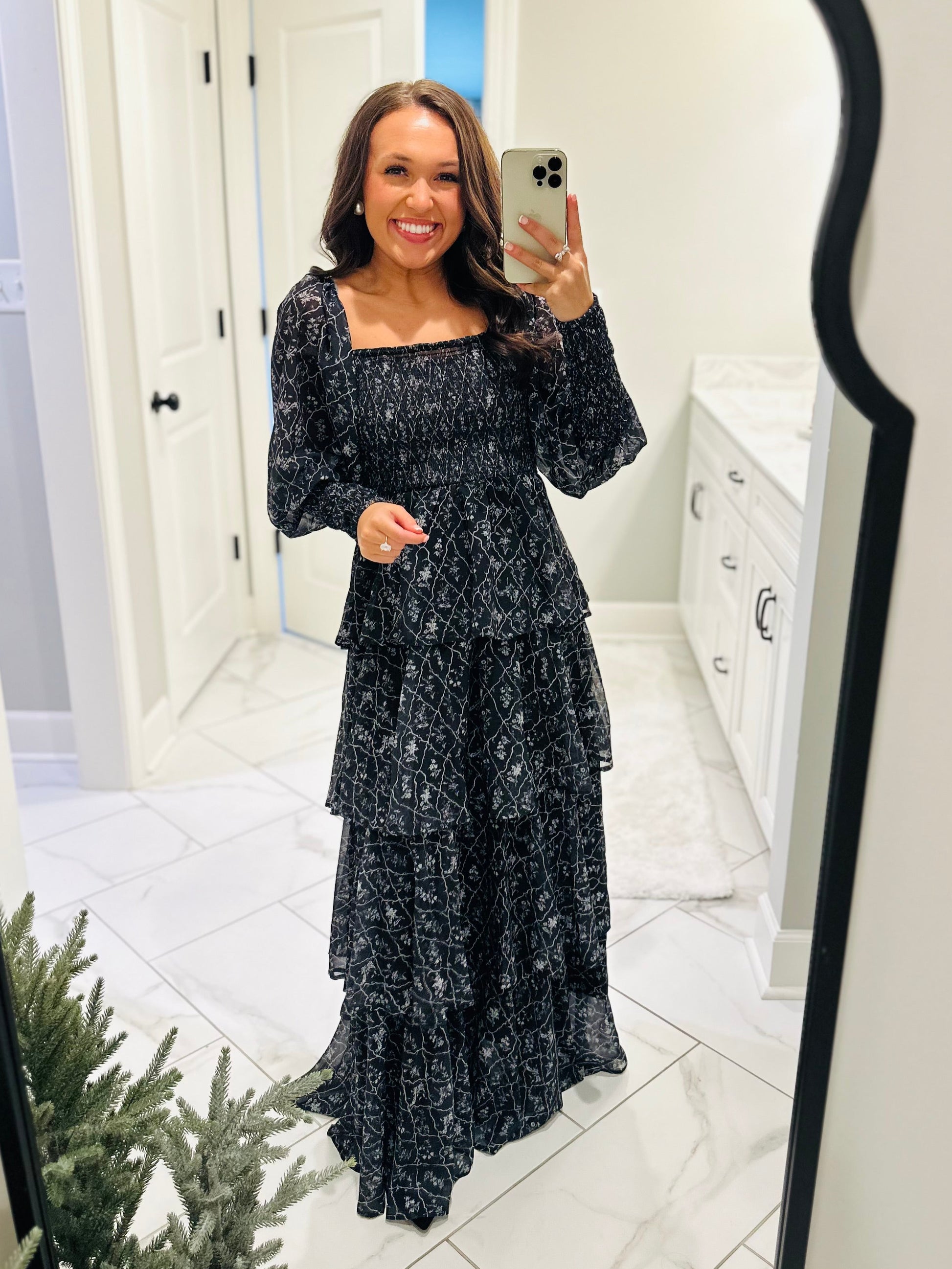 Our new favorite maxi! This stunning dress is so fun, classy, and versatile. This dress features a beautiful black floral print with long sleeves, smocked bodice, square neckline, and a ruffle tiered silhouette. It's perfect for church, weddings, or any special event. It's a classic elegance with a floral twist.