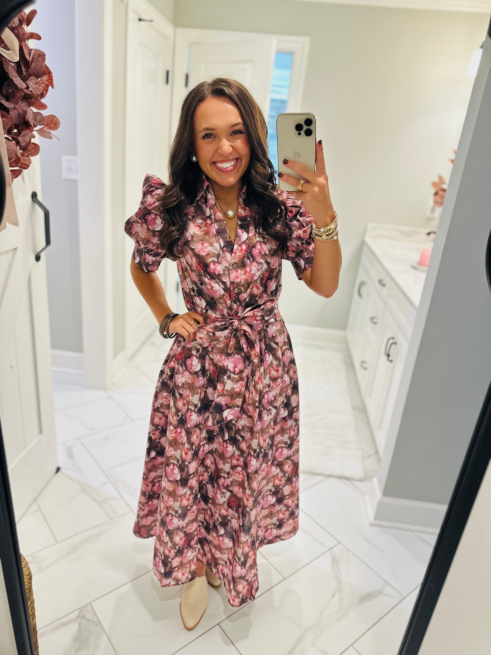 The colors, the bow, the detailing, the fit... everything with this dress is just absolutely gorgeous! It is so feminine, chic, and trendy. This dress features a beautiful pink and brown floral print, short puff sleeves, spread collar with button front closure, and an elastic waist at back with an adjustable self-tie bow tie. It has pockets too. This dress is perfect for work, date night, and simply every occasion! Layer a cardigan or denim jacket over it for cooler temps.